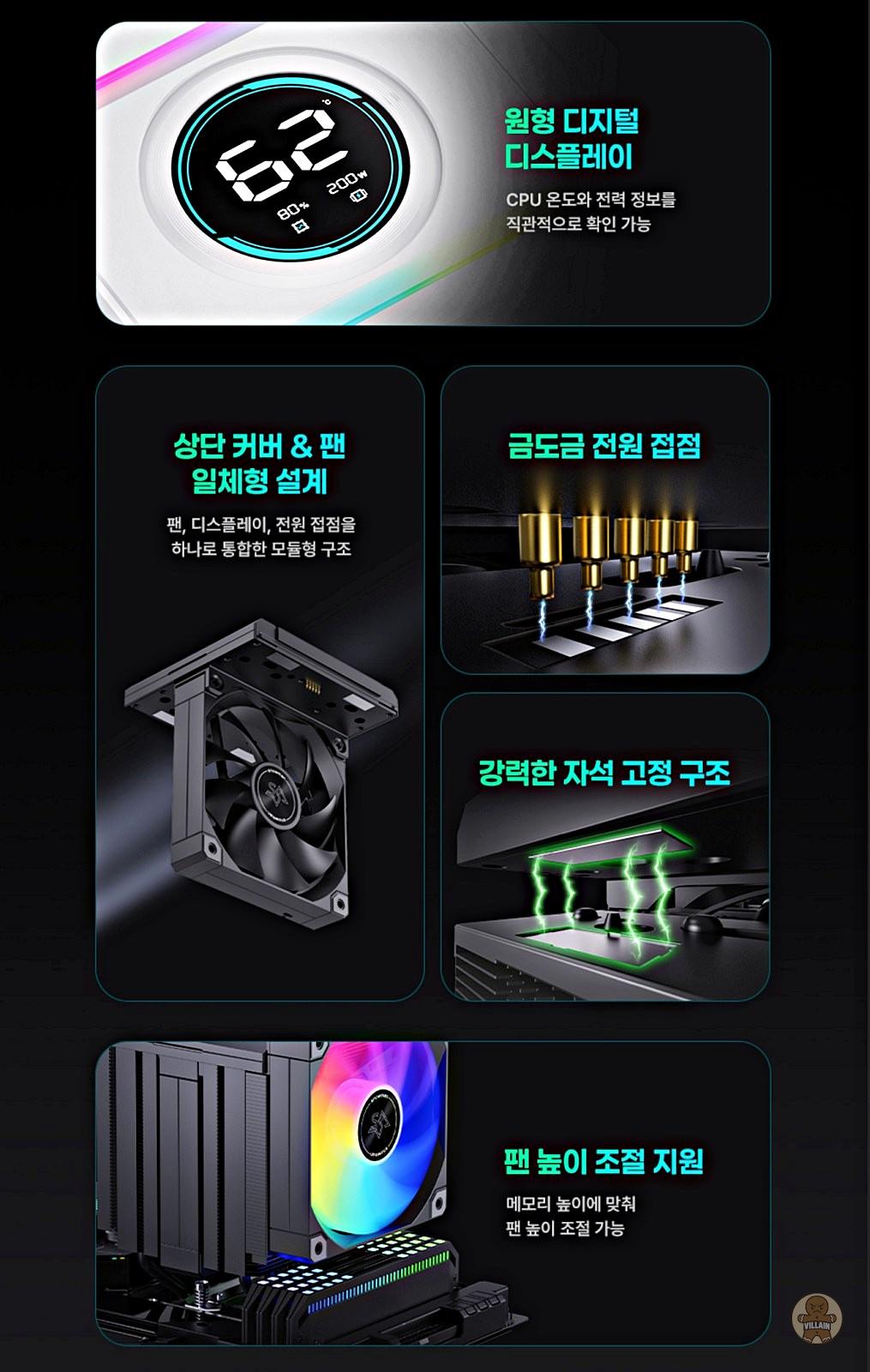 상단에 적용된 원형 디지털 디스플레이는 전용 소프트웨어와 USB 2.0 9핀 인터페이스를 통해 CPU 온도, CPU 전력 사용량, CPU 사용률 등 주요 시스템 정보를 실시간으로 표시한다. 사용자는 별도의 모니터링 프로그램을 실행하지 않아도 시스템 상태를 한눈에 확인할 수 있으며, 튜닝 요소에 그치지 않고 실사용 편의성까지 높인 점이 눈에 띈다.