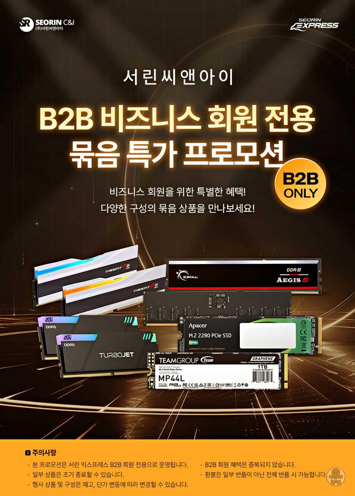 컴퓨터 관련 주요 부품 수입 유통 전문 업체 서린씨앤아이가 자사몰인 서린 익스프레스를 통해 B2B 비즈니스 회원을 위한 전용 묶음 특가 프로모션을 진행한다. 프로모션은 서린 익스프레스에 등록된 B2B 비즈니스 회원에게만 혜택이 노출되며 해당 등급의 회원만 특가 상품을 조회하고 구매할 수 있는 비즈니스 전용 행사다.