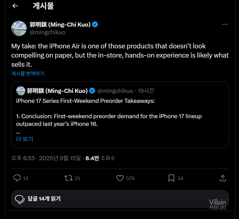 애플 전문 분석가 궈밍치는 엑스를 통해 “아이폰17 라인업의 첫 주말 사전 주문 수요가 아이폰16을 웃돌았다”며, “프로 맥스, 프로, 표준 모델의 2025년 3분기 생산 계획은 전년 동기 대비 약 25% 늘었고, 예상 배송 지연 기간은 약 1주일 정도만 더 길어졌다"고 주장했다.