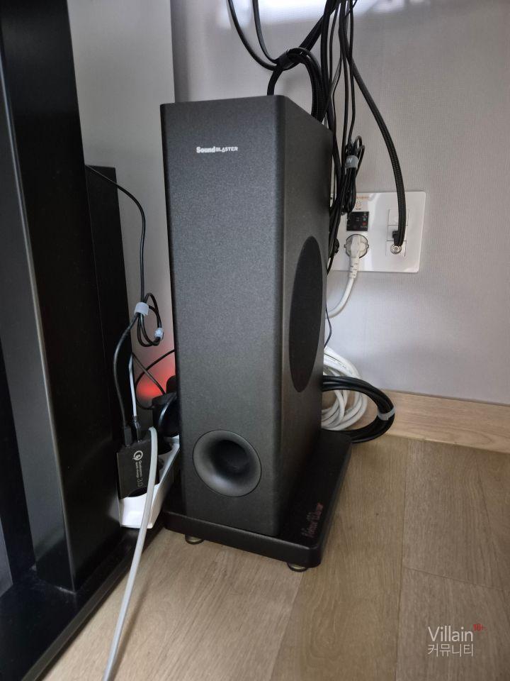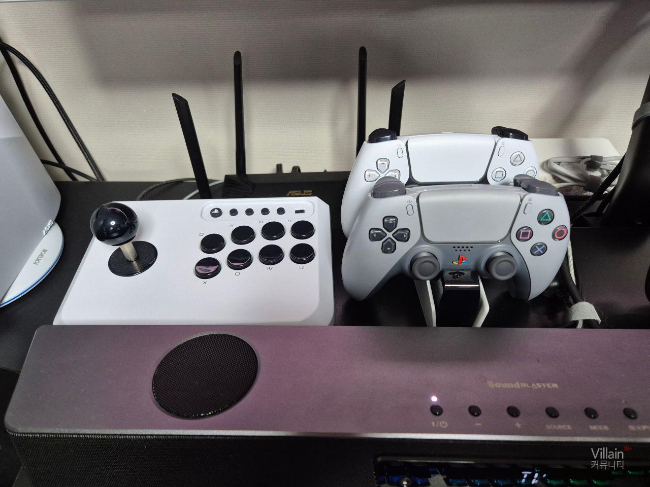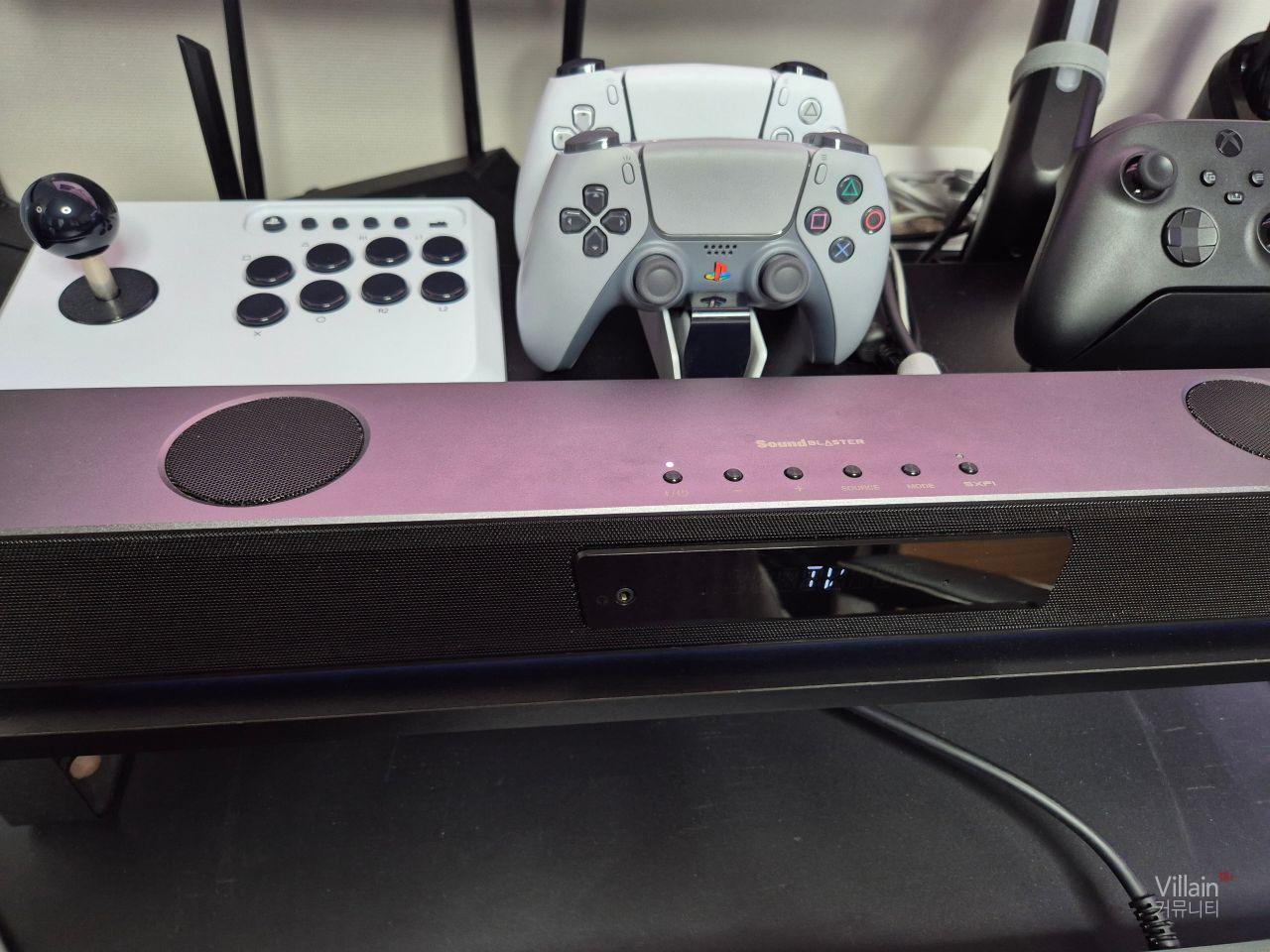 사운드바는 크리에이티브의 katana v2x입니다. 23년도에 구매해서 현재까지 사용중인데 작은크기의 사운드바 치고는 음질이 괜찮습니다. e-ARC 덕분에 모니터와 연결하여 PC와 플스 두개의 사운드를 출력할 수 있습니다.