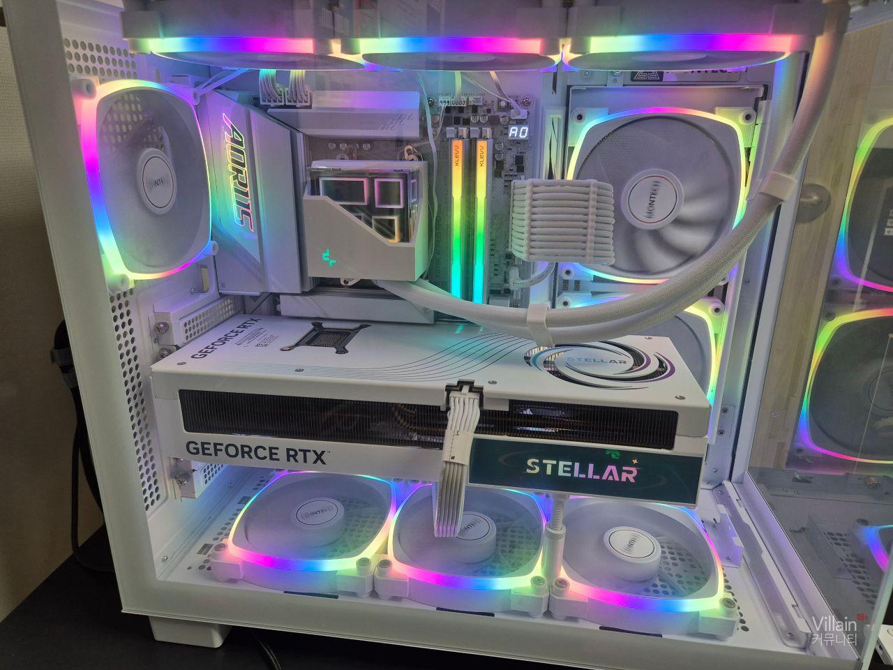 드디어 본체입니다. 케이스는 montech king 65 pro에 983d 만리 스텔라 5080 조합입니다. 4080s쓰다가 5000번대 출시 직전 팔아버리고 내장그래픽생활하다가 못견디고 스텔라로 구매했네요… 화이트빌드라 5080 솔리드oc화이트가고싶었는데 손가락이 느려서 구매할수가 없었습니다ㅠㅠ 돈벌어서 5090솔리드oc 화이트 살거에요. 수랭쿨러는 딥쿨 lt720인데 원래팬이 소음이 심해서 별도로 케이스와 동일한 팬을 달았습니다.