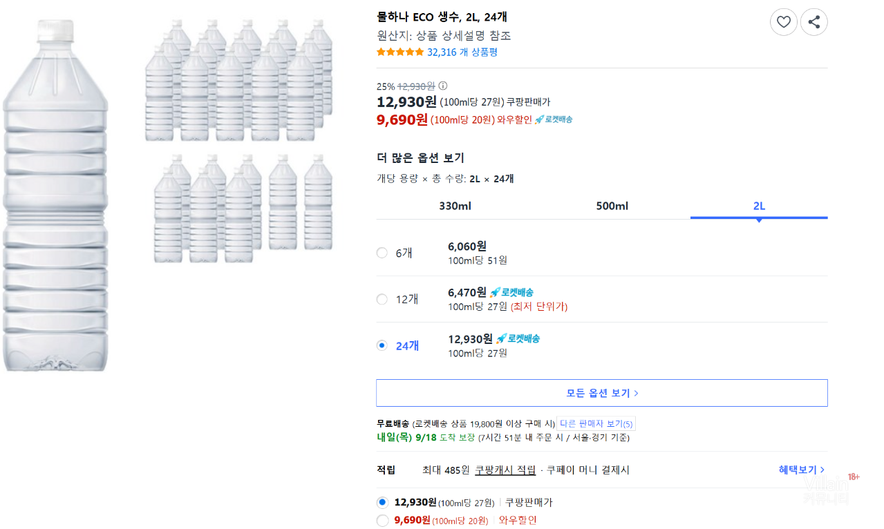물하나 ECO 무라벨 생수 2L × 24병 — 와우할인 9,690원