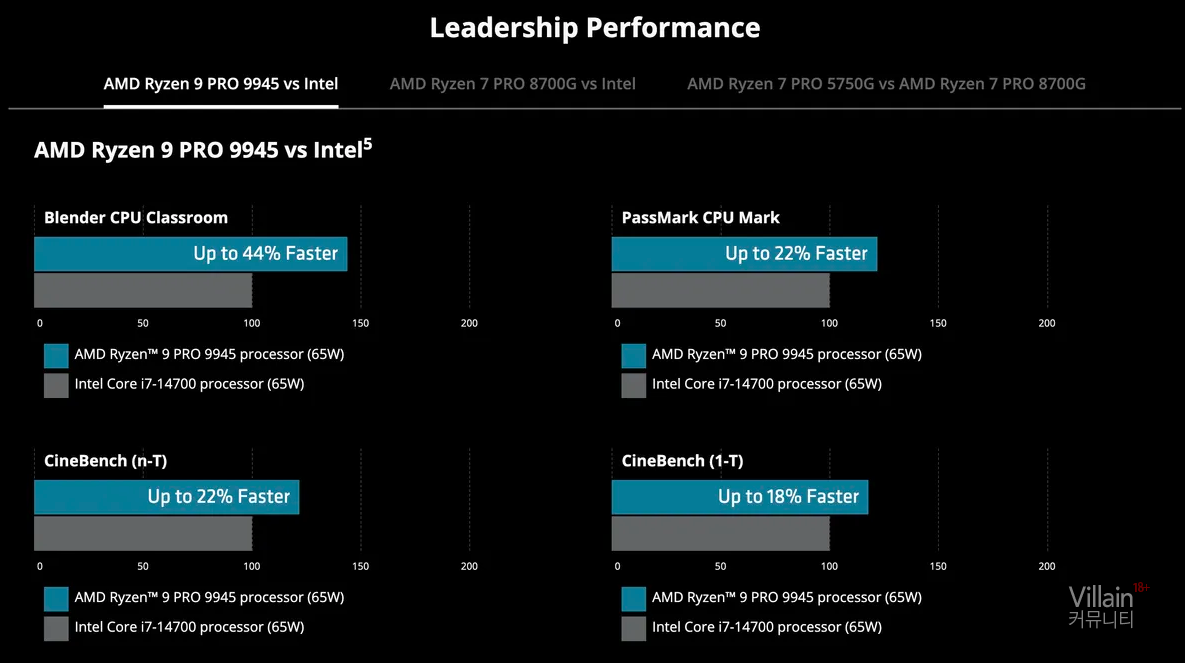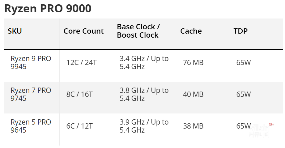 다만, Ryzen 9 Pro 9945는 전 세대 대비 기본 클럭이 300MHz 낮아져 (3.4GHz vs 3.7GHz) 성능 면에서 아쉬움이 남는다.