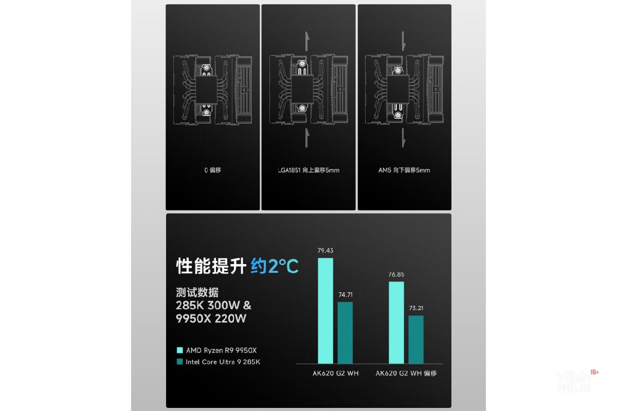 AK620 G2는 전금속 소재의 오프셋 조정 가능한 전용 브라켓을 채택해, 인텔 LGA1851 소켓에서 상단 5mm, AMD AM5 소켓에서 하단 5mm 조정이 가능하다. 이를 통해 CPU 발열원의 중심부와 히트파이프를 보다 정밀하게 맞출 수 있으며, 제조사 공식 테스트 결과 약 2℃ 성능 향상이 확인됐다.