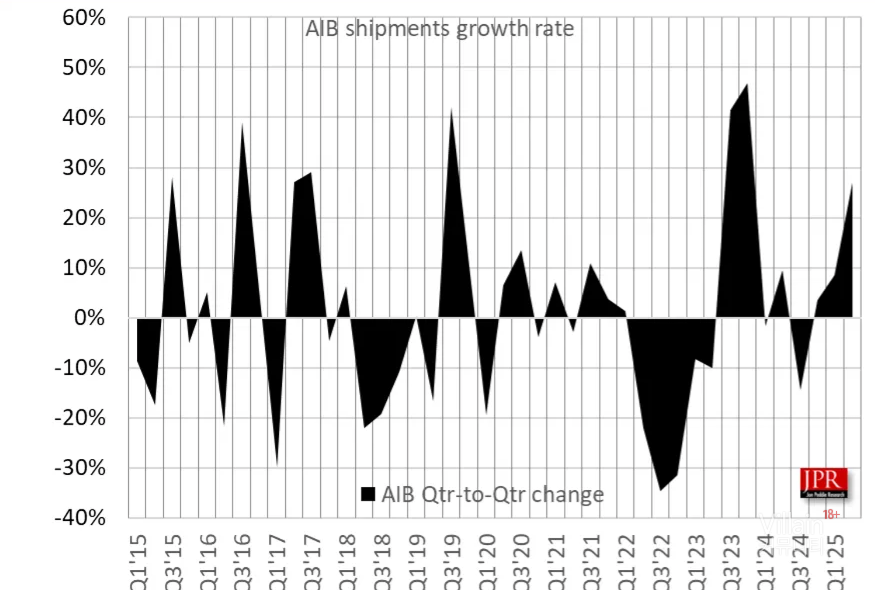 가장 두드러진 수치는 데스크톱용 독립 그래픽카드(AIB, 애드인보드)였다. 분기 대비 27%, 전년 동기 대비 22%라는 폭발적인 증가세를 보였는데, 이는 세 업체 모두가 선보인 인상적인 신형 하드웨어 덕분이었다. 엔비디아의 시장 장악력은 한층 더 강화되어, 앞서 보도된 바와 같이 AIB 시장 점유율이 무려 94%까지 치솟았다.