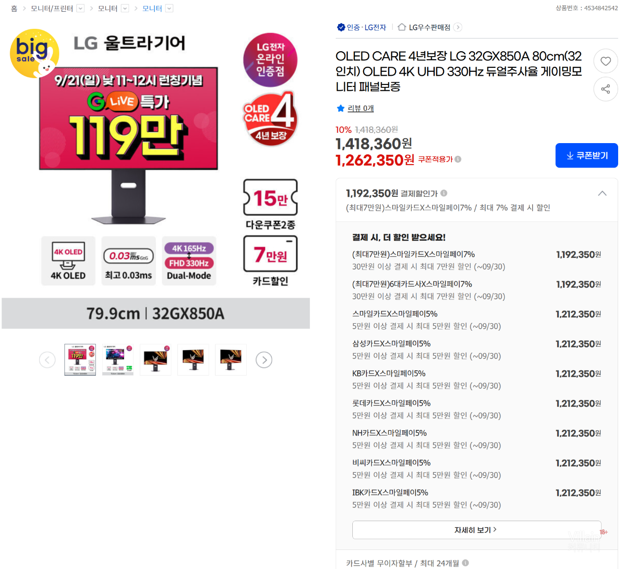 LG 32GX850A 80cm(32인치) OLED 4K UHD 330Hz 1,192,350원