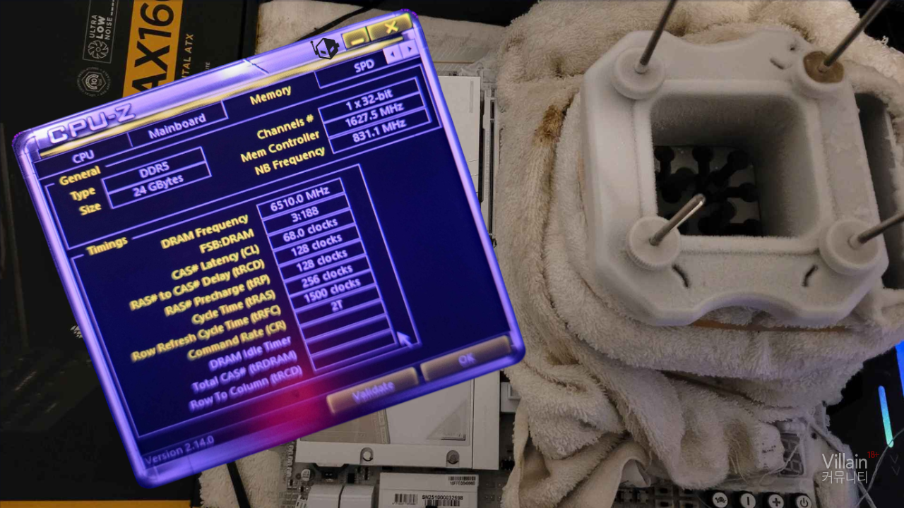 메인보드 상단 전체, 즉 CPU와 DDR5 슬롯 부분은 전용 LN2(액체질소) 냉각 장치로 냉각됐다. 사용된 기가바이트 Z890 AORUS Tachyon ICE는 플래그십급 오버클러킹 전용 메인보드로, DDR5 DIMM 슬롯은 두 개만 탑재되어 있다. 이 보드는 올해 3월에도 DDR5 메모리 오버클록 기록인 12,726MT/s를 달성한 바 있으며, 이번에 마침내 13,000MT/s 장벽을 넘게 됐다.