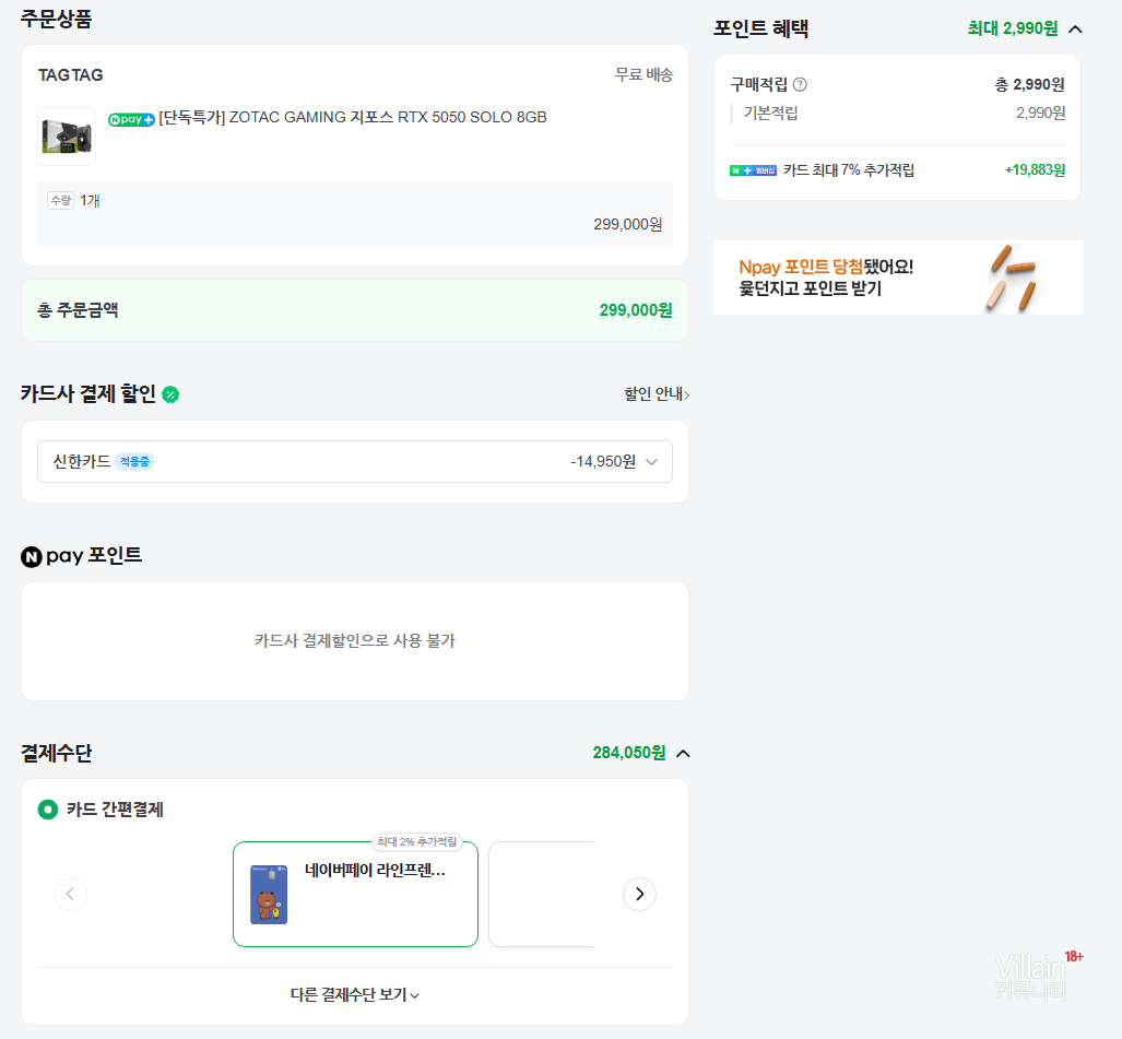 5% 할인 받으면 284050원이고, 저는 지금 멤버십 적립 다 써서 없는데 멤버십 적립 1%도 가능합니다.