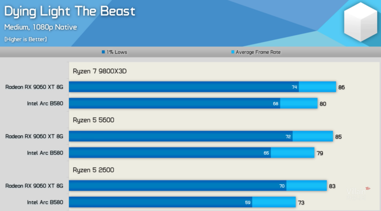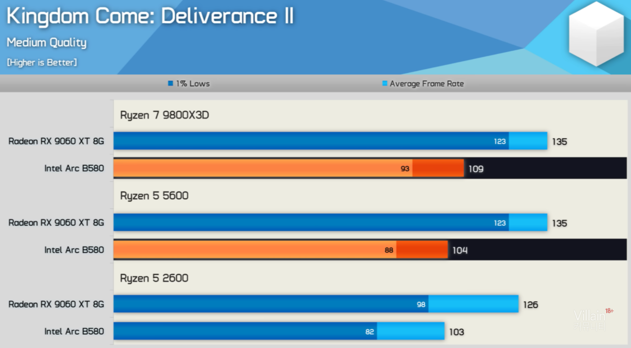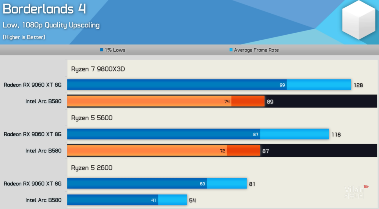 사이버펑크 2077: 팬텀 리버티에서도 비슷한 상황이었지만, 이번에는 더 인상적인 결과가 나왔다. Arc B580은 라이젠 5 2600과 조합했을 때 RX 9060 XT와 비교해도 성능 저하(regression)가 전혀 나타나지 않은 것이다.