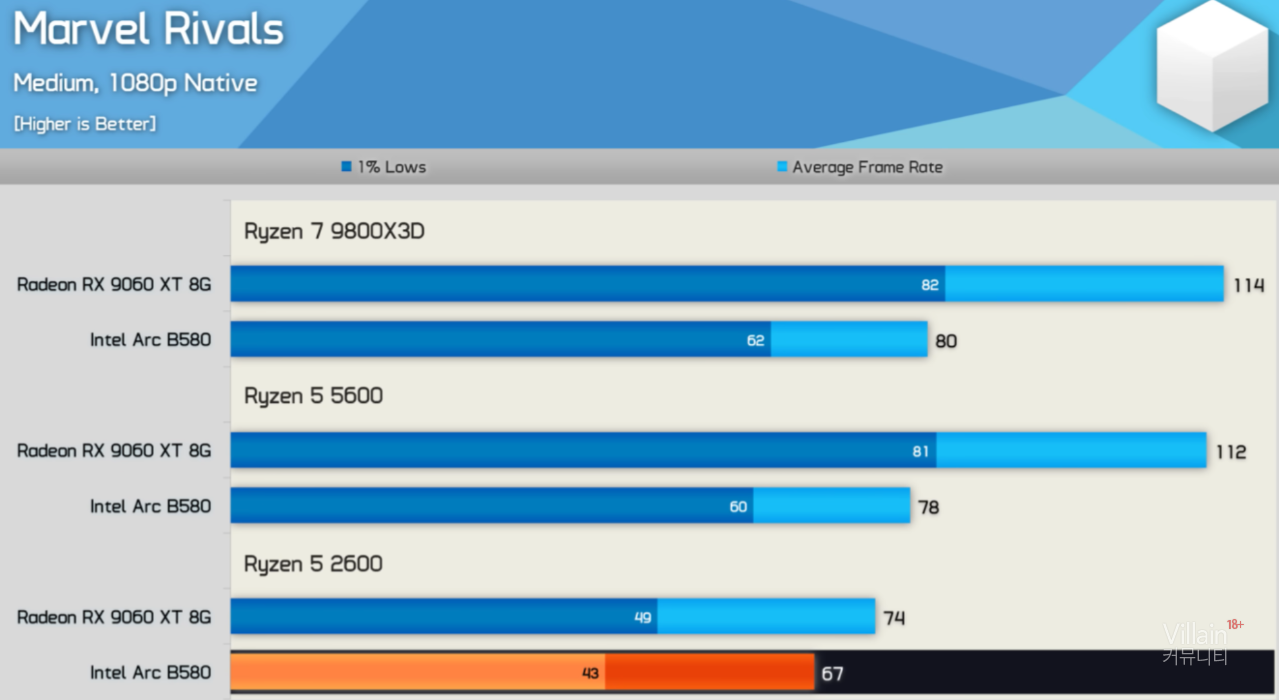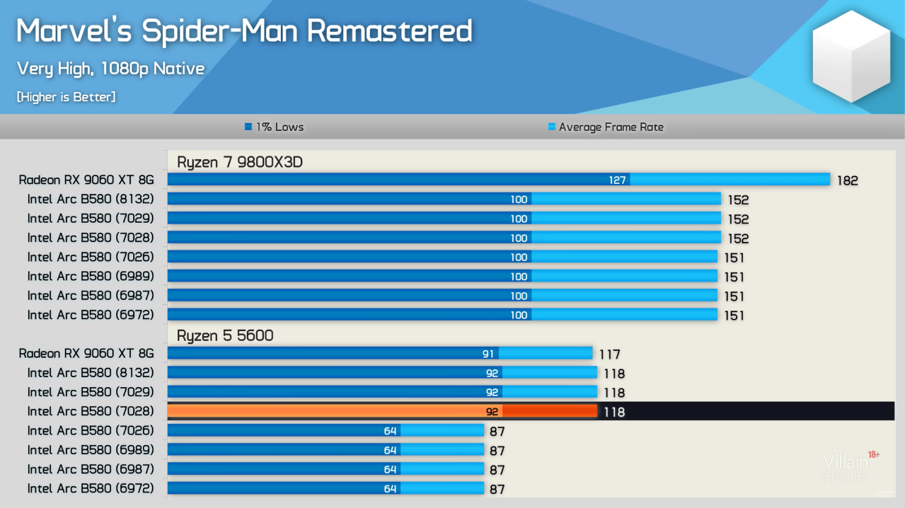 새로운 벤치마크 결과에 따르면, 일부 게임에서 문제가 상당 부분 해결된 것으로 나타났다. 예를 들어 Marvel’s Spider-Man Remastered의 경우, 라이젠 5 5600과 조합했을 때 RX 9060 XT 8GB와 비교하면 Arc B580의 성능이 극심하게 떨어졌다. 두 GPU 모두 CPU 선택 때문에 발목이 잡히긴 했지만, Arc B580 쪽의 성능 저하는 훨씬 심각했다.