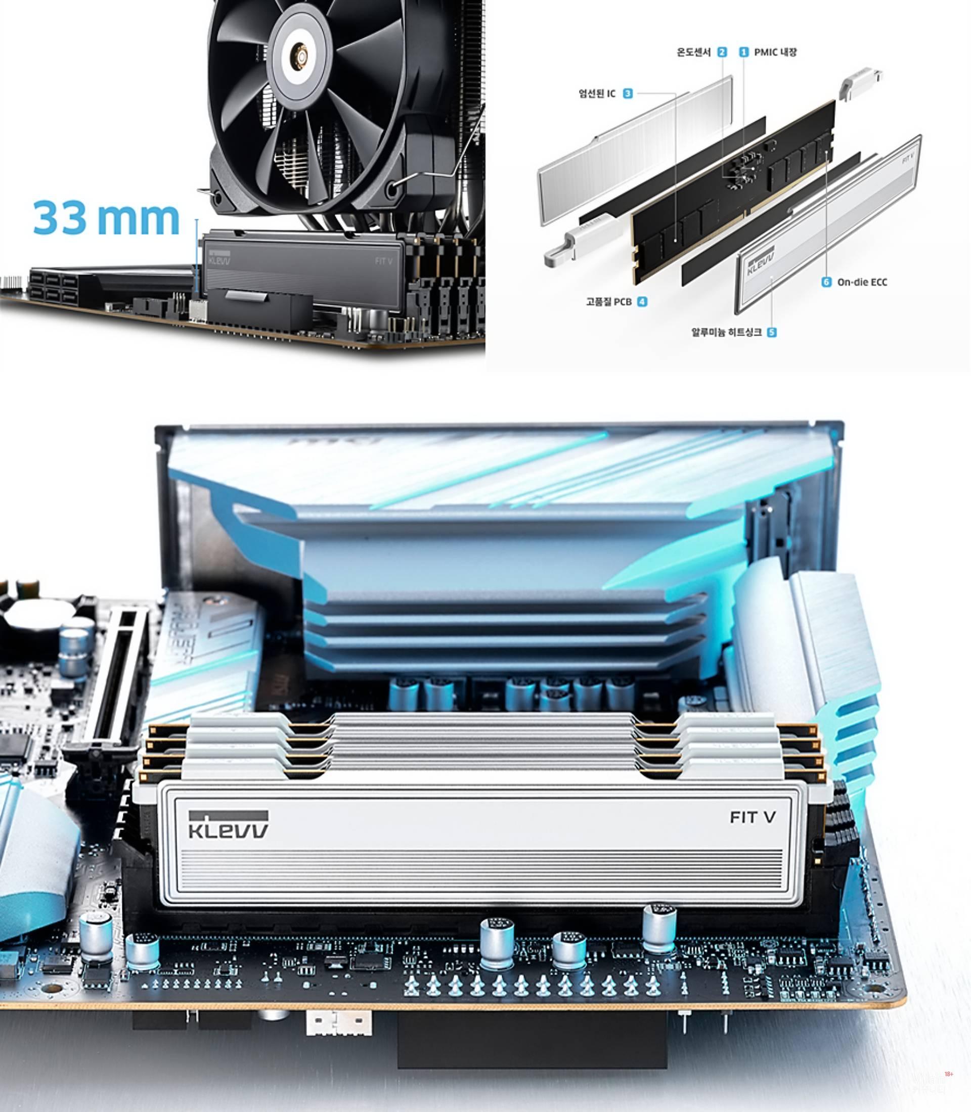 FIT V 시리즈는 DDR5 기반 메모리로, 6,400MHz(51,200MB/s) 동작 속도와 30-38-38-78의 램타이밍을 지원한다. LP(Low Profile) 타입 알루미늄 히트싱크 설계를 적용해 RGB 튜닝 요소를 배제하고 실용성 중심 사용자에 적합하며, 기판과 동일한 높이로 구성돼 CPU 쿨러 및 기타 부품과의 간섭 가능성을 낮췄다.