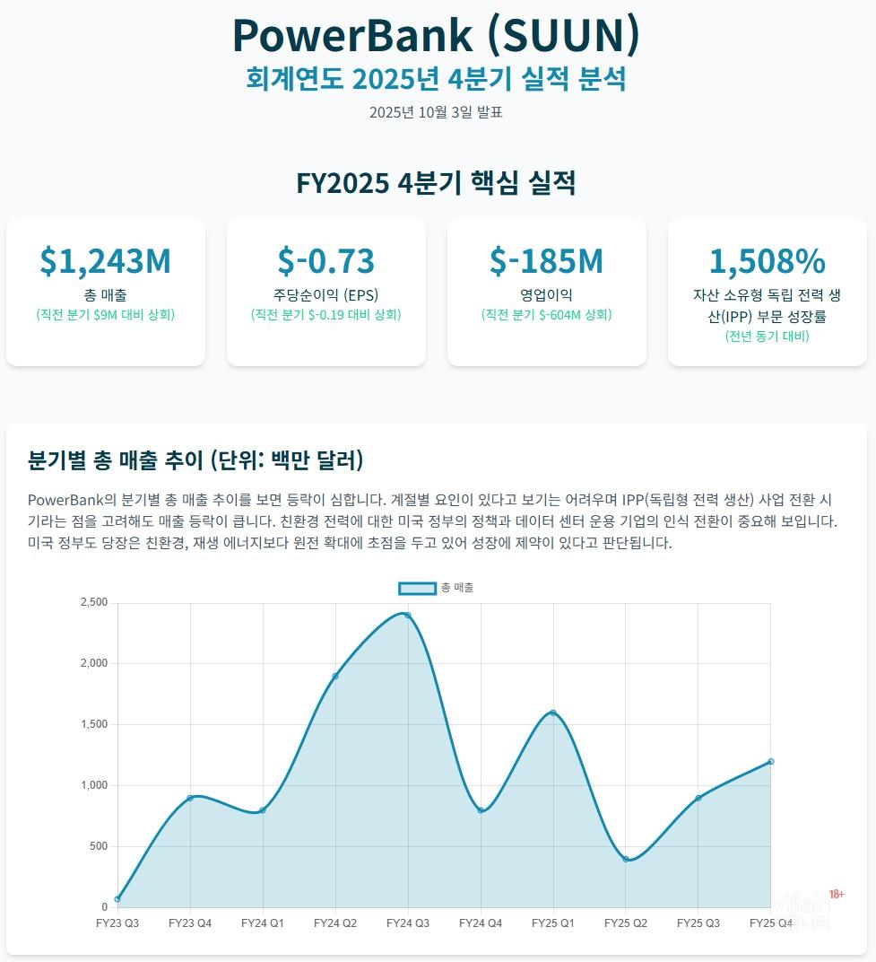 미국 현지 기준으로 2025년 10월 3일입니다. 지난 주 토요일에 파워뱅크(구 솔라뱅크, 나스닥 : SUUN)가 실적을 공개했습니다. 회계연도 2025년 4분기입니다. 분기 및 연간 마감을 진행한 것이죠. 참고로 파워뱅크는 태양광과 배터리 기술을 보유한 기업으로 데이터 센터 전력 공급 사업에 집중하고 있습니다.