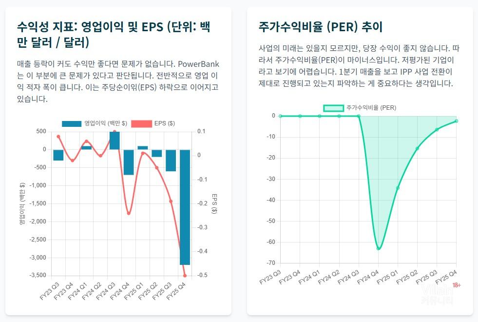 회계연도 2025년도 총매출은 전년 대비 29% 감소한 4150만 달러(이하 캐나다 달러 기준)를 기록했습니다. 이전 해보다 1690만 달러 줄었습니다. 그러나 이 결과는 성장하는 쪽에 집중하기로 한 의도적 결정의 결과라는 게 파워뱅크 쪽 입장이네요. 우선, 연간 EPC 서비스 매출이 3080만 달러에서 2330만 달러로 감소했습니다. 이게 전체 수익에 영향을 줬네요. 누적 순손실은 연간 3110만 달러입니다. 이 실적으로 인해 주당 순이익(EPS)이 월가 컨센서스 0.03달러를 크게 밑도는 -0.49달러가 되었습니다.