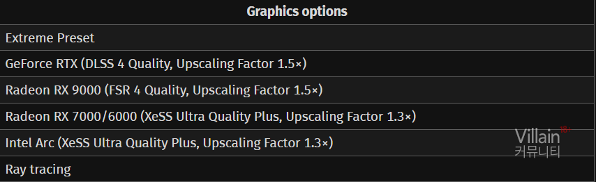 ComputerBase는 이번 테스트에서 AMD, NVIDIA, Intel의 최신 GPU를 동일 조건에서 비교했으며, 업스케일러는 ‘품질(Quality)’ 설정으로 진행됐다. 게임은 기본적으로 DLSS 4를 지원하지만, 현재로서는 FSR 4를 기본 지원하지 않는다. 다만 FSR 3.1을 포함하고 있으며, 최신 Adrenalin 드라이버를 이용하면 RDNA 4 GPU에서 FSR 4로 업그레이드 가능하다.