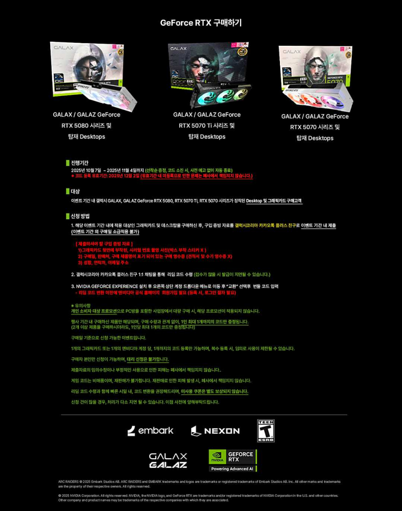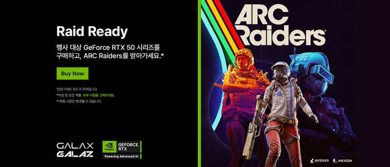 "갤럭시코리아가 10월 7일부터 11월 4일까지 RTX 5080, RTX 5070 Ti, RTX 5070 그래픽카드 또는 해당 GPU 탑재 완제 PC 구매자를 대상으로, 액션 어드벤처 게임 ‘아크 레이더스’ 번들을 증정하는 프로모션을 진행한다. 게임 코드는 선착순 한정 수량으로 제공된다."