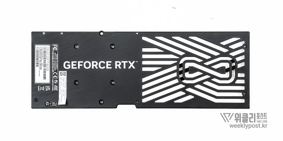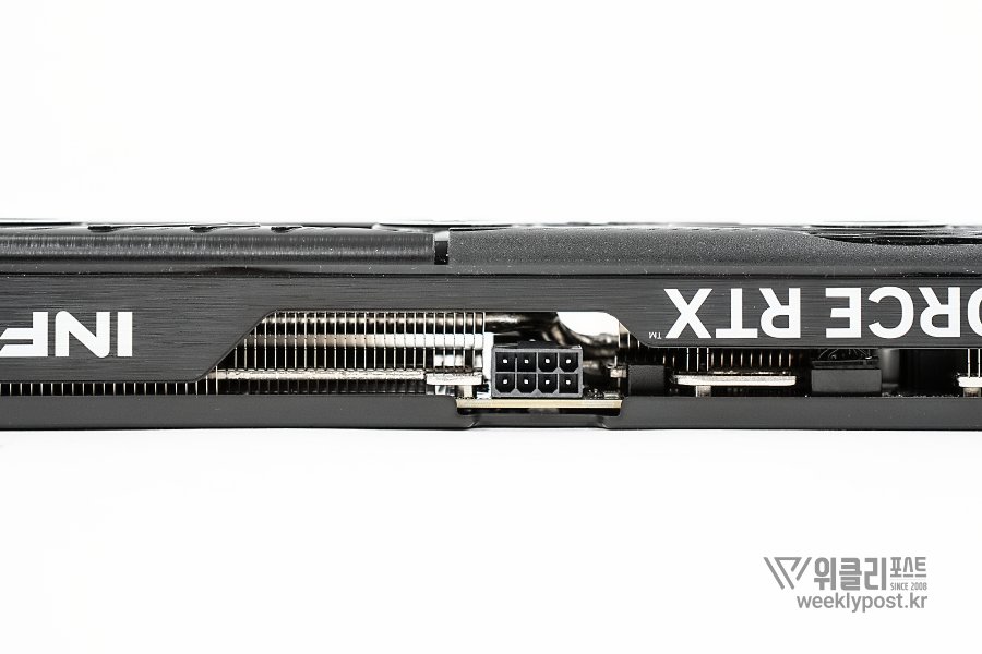 길이 29.0cm, 폭 12.5cm, 두께 41mm로 설계됐다. 무게는 709g이며 이중 슬롯 구조를 따르므로 ITX나 mATX 기반의 컴팩트 시스템에도 부담 없이 장착된다. 전면 shroud는 블랙 컬러를 기본으로 하여 모델명을 흰색 서체로 표기했고, 후면은 플라스틱 백플레이트를 적용했다. 백플레이트에는 다수의 통풍구를 마련해 기판 후면에 형성되는 열기를 자연 배기로 유도한다.