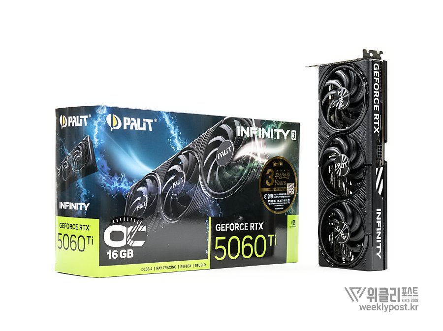 엔비디아는 메인스트림 시장의 교두보를 확보하기 위해 지포스 RTX 5060 Ti를 투입했다. 자료에 따르면 라인업은 8GB와 16GB 두 가지 메모리 사양으로 나뉘며 권장가는 각각 375달러, 425달러다. 팔릿이 선보인 ‘인피니티 3’는 9‑블레이드 팬 세 개를 배치한 트리플 팬 쿨러를 적용해 작은 외형(길이 29 cm, 두께 41 mm)에서도 냉각 효율을 확보했다. 참고로 리뷰로 소개하는 OC와 1만 저렴한 non-OC 까지 두 라인업 모두 외관은 동일하다.