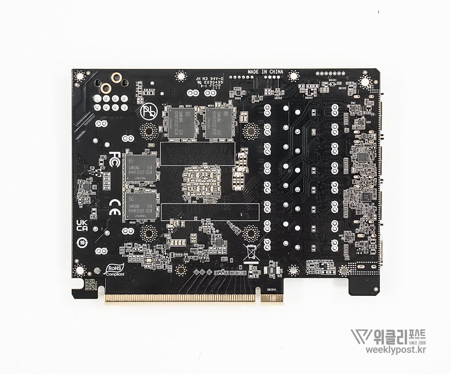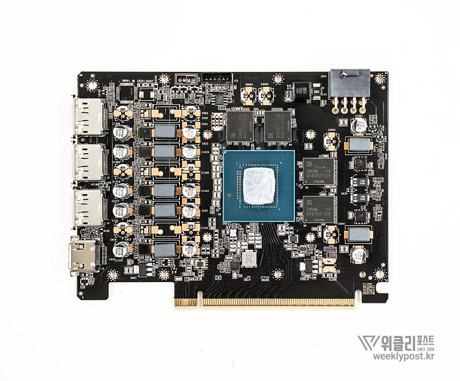 참고로 5페이즈 GPU VRM은 Alpha&Omega AOZ73004CQI 컨트롤러가 관리하며, Vishay SIC653A DrMOS(50A 정격)로 구성된다. 메모리 전원부는 2페이즈로, 7222 벅 컨트롤러와 Sinopower SM7342EKKP 듀얼 MOSFET이 사용됐다. PCB 전원부 배치는 GPU 코어와 메모리 양쪽에 균형 있게 배치해 전력 전달 경로를 단축했다.