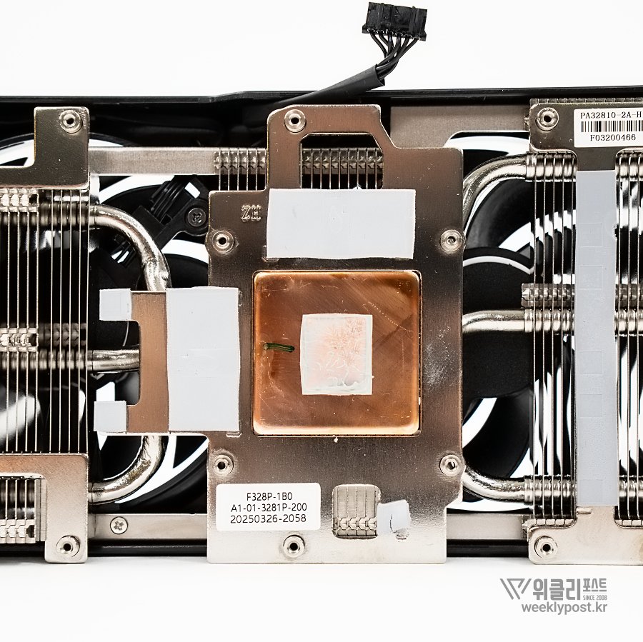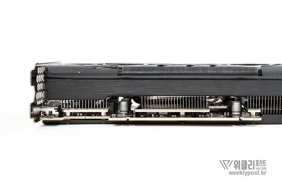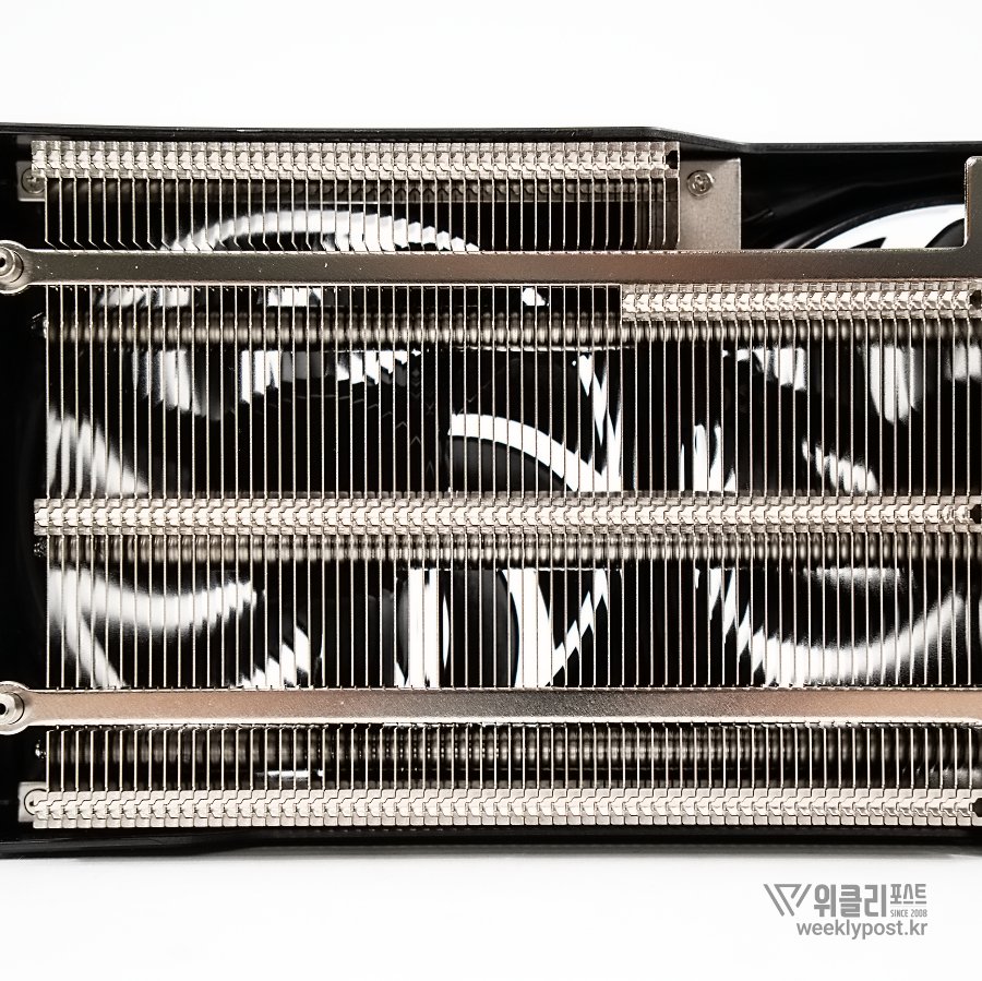 냉각 솔루션은 9‑블레이드 팬 세 개와 Ø6mm 히트파이프 세 개, 알루미늄 핀스택 방열판으로 구성된다. 히트파이프는 GPU, 메모리, 5페이즈 전원부까지 직접 접촉하며, 전체 열을 균일하게 분산한다. LED 조명은 제외해 전력 소비와 내부 발열 요인을 최소화했다.