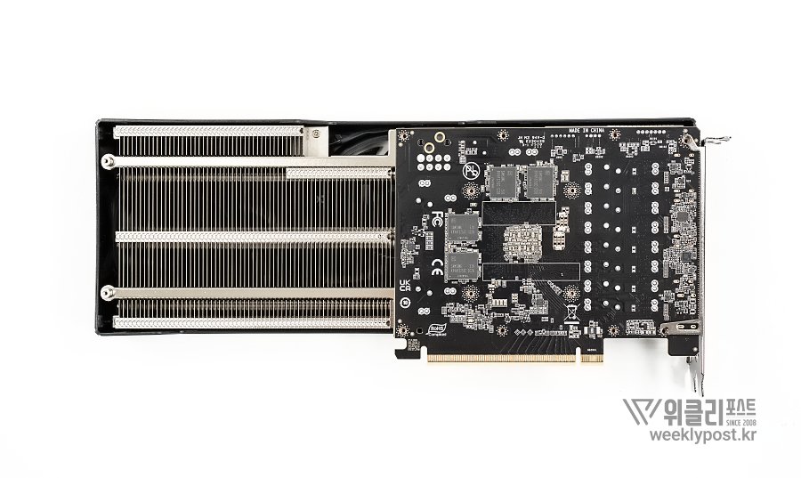 연결 인터페이스는 PCIe 5.0 x8로 구성돼 최신 플랫폼과 충분한 대역폭을 확보했다. 때문에 실제 기판 면적은 전체 카드 길이의 절반 수준이지만 쿨링과 장착 호환성을 고려해 풀 사이즈 PCB를 유지한 점이 인상깊다. 전원 입력은 단일 8‑핀 커넥터, 소비전력은 180 W로 설정됐다.