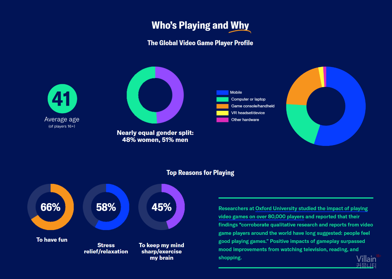 「Power of Play: 2025 Global Video Games Report」에 따르면, 전 세계 비디오 게임 플레이어의 평균 연령은 41세입니다.