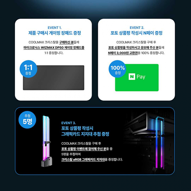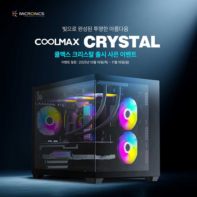 마이크로닉스는 COOLMAX 크리스탈 출시를 기념해 10월 16일부터 11월 16일까지 구매 이벤트를 진행한다. 행사 기간 동안 제품을 구매하면 WIZMAX DP50 게이밍 장패드가 1:1 증정되며, 포토 상품평 작성 시 네이버페이 3,000원 교환권이 지급된다. 또한 후기 작성자 중 5명을 추첨해 그래픽카드 지지대를 추가로 제공한다.