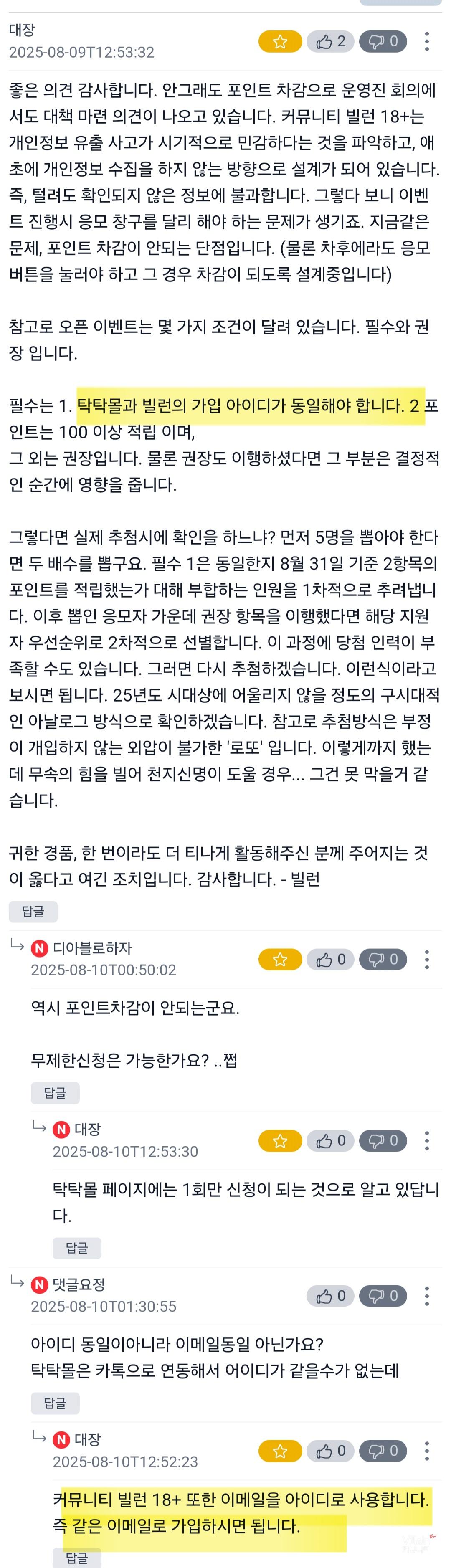 계정에 관한 조건은 충분히 안내를 하셨다고 했는데 이벤트공지에서는 동일이메일로 되어있고 댓글에는 동일아이디로 되어있고 탁탁몰 카톡가입자에대해서는 또 동일이메일로 답변을 주셨습니다