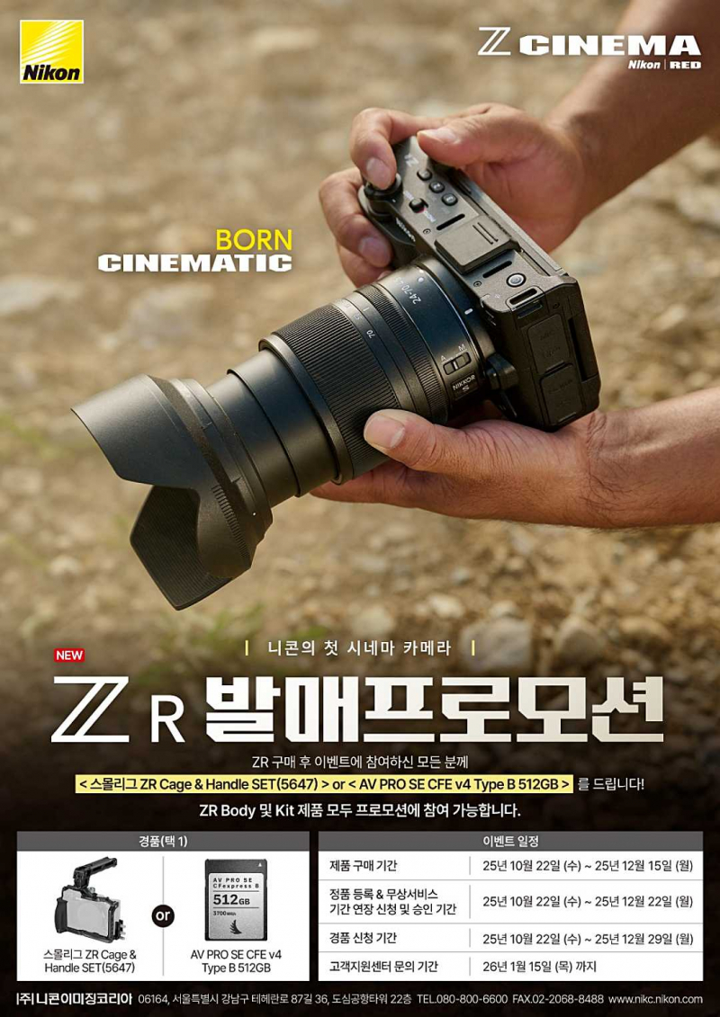 ZR은 니콘의 자회사 RED Digital Cinema, Inc.(RED)와 공동 개발한 시네마 전용 ‘Z CINEMA’ 시리즈의 첫 번째 모델로, 10월 22일부터 공식 판매가 시작된다. 프로모션을 통해 ZR 구매 고객에게는 ▲스몰리그 ZR Cage & Handle SET(5647) ▲AV PRO SE CFE v4 Type B 512GB 중 한 가지가 제공된다. 두 경품 모두 영상 제작 현장에서 활용도가 높은 프리미엄 액세서리로, ZR의 시네마틱 퍼포먼스를 완성도 높게 지원한다.