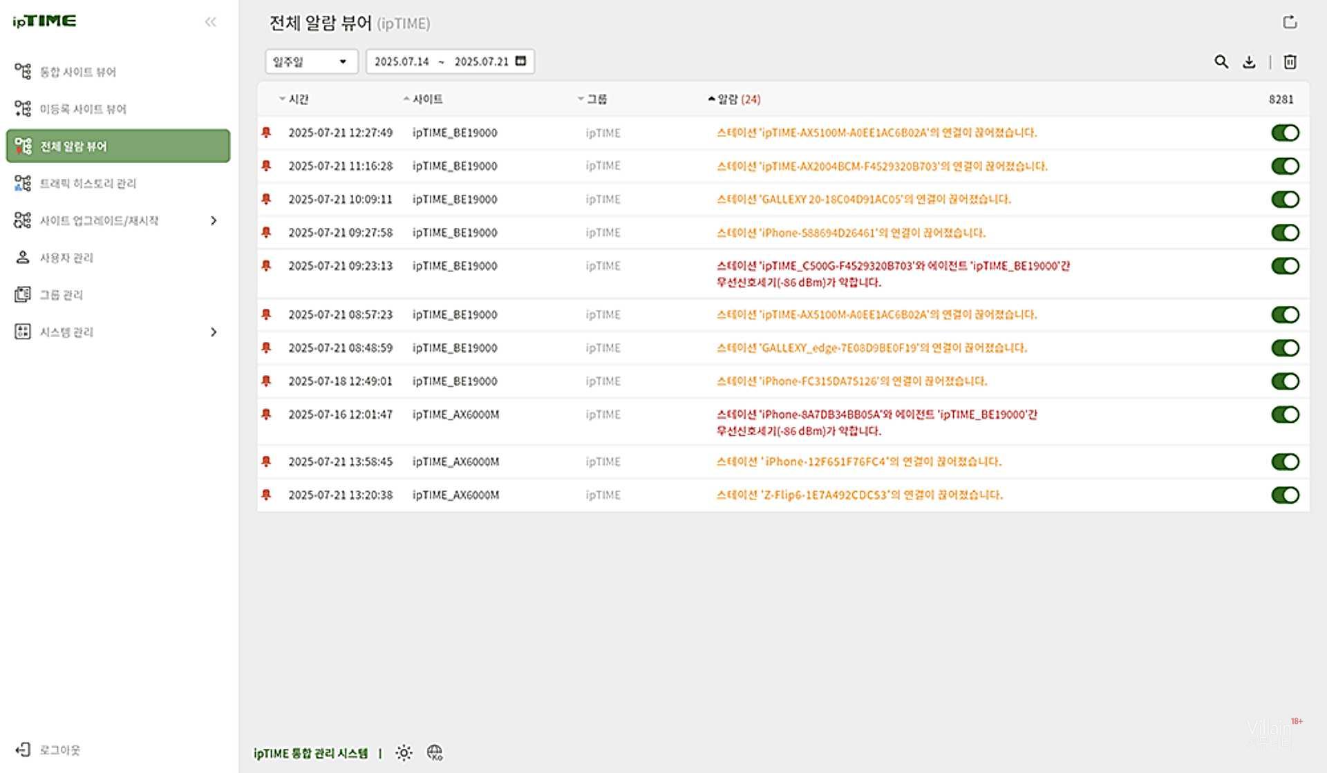 웹 기반 UI를 통해 수천 개 이상의 공유기를 통합 운영할 수 있으며, 각 장비의 연결 상태와 단말의 실시간 접속 정보를 확인할 수 있다. 이벤트 발생 시 알림 아이콘이 실시간 표시되며, MAC 주소, 신호 세기, 디바이스 이름 등 상세 정보가 함께 제공돼 장애 대응 시간을 줄일 수 있다.