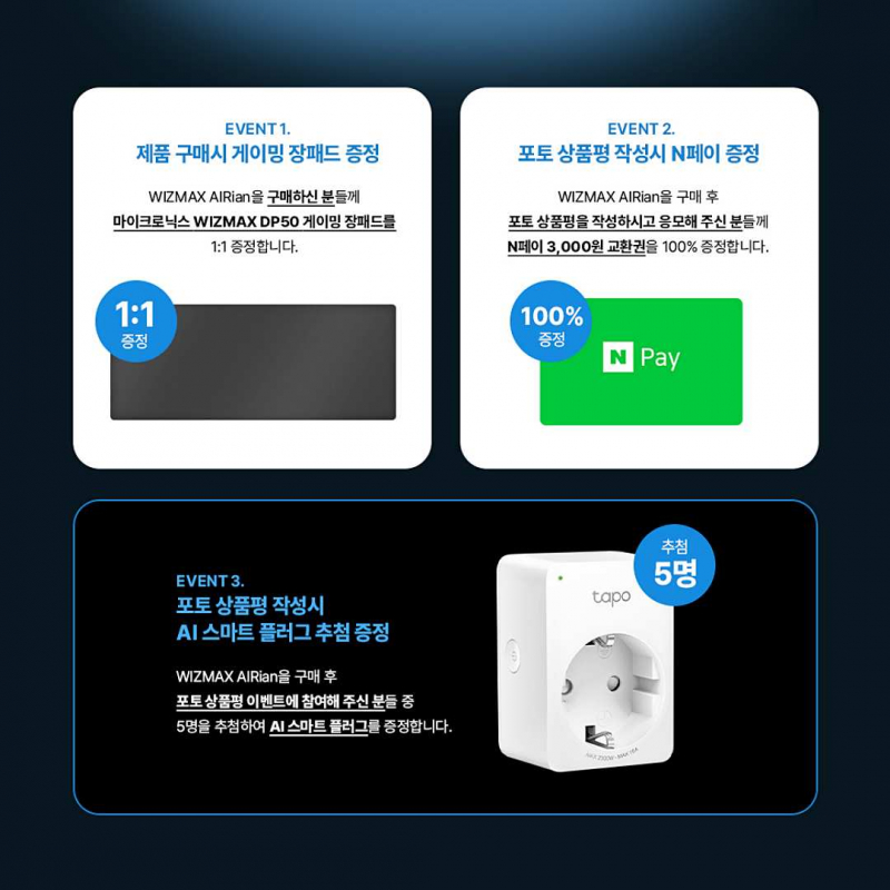 마이크로닉스는 WIZMAX 에어리안 130 출시를 기념해 10월 21일부터 11월 21일까지 구매 고객 대상 사은 이벤트를 진행한다. 제품 구매 고객 전원에게 ‘DP50 게이밍 장패드’를 증정하며, 포토 상품평 작성 고객 전원에게 네이버페이 3만 원 교환권을 제공한다. 응모자 중 5명을 추첨해 ‘AI 스마트 플러그’도 추가 증정한다.