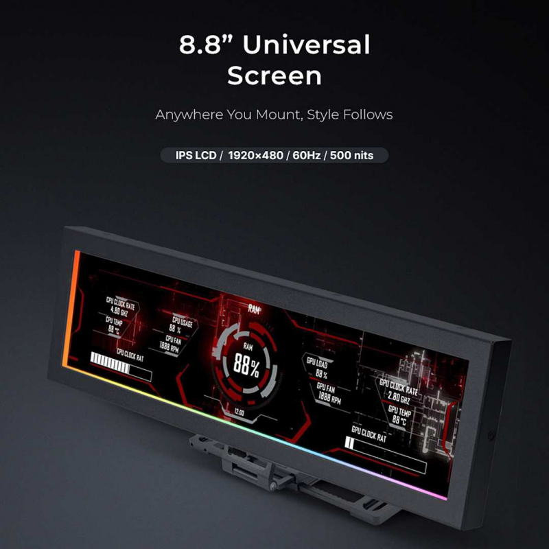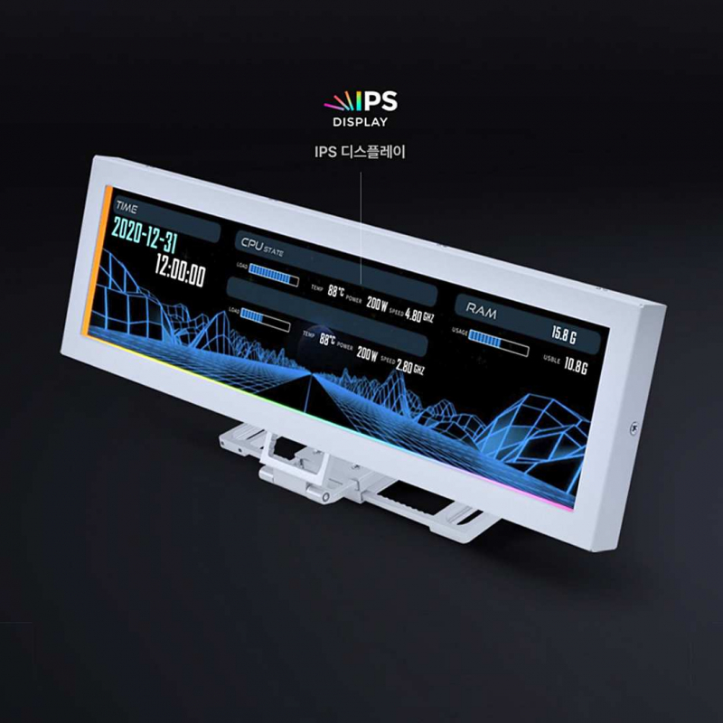 패널은 8.8인치 초광폭 IPS를 채택해 넓은 시야각과 선명한 색 표현을 제공한다. 시스템 상태 패널은 물론 이미지와 GIF, 동영상 등 다양한 콘텐츠를 높은 가시성으로 표시해 튜닝 효과와 정보 가독성을 동시에 높였다. 또한 USB 9핀 헤더나 후면 I/O Type-A 포트를 통해 연결되기 때문에 별도의 GPU 연결이 필요 없으며, 동봉된 케이블과 직각 어댑터를 이용해 깔끔한 배선이 가능하다.