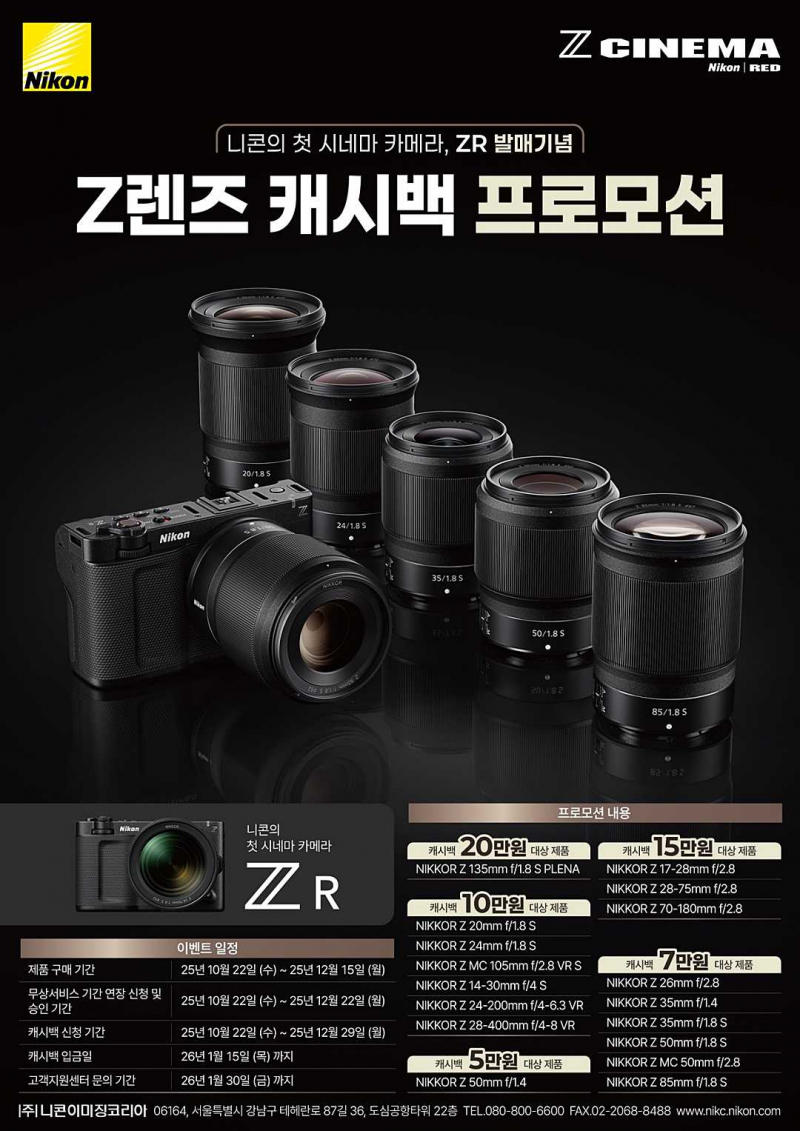 프로모션은 NIKKOR Z 135mm f/1.8 S PLENA, NIKKOR Z 17-28mm f/2.8 등 총 17종의 미러리스 전용 렌즈를 구매한 고객을 대상으로 한다. 캐시백 금액은 제품에 따라 5만 원부터 최대 40만 원까지이며, ZR과 함께 사용할 때 최적의 성능을 발휘하는 렌즈로 구성됐다.