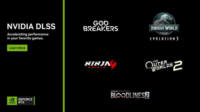 DLSS 4 멀티 프레임 생성(Multi Frame Generation)은 ‘아우터 월드 2(The Outer Worlds 2)’, ‘뱀파이어: 더 마스커레이드 – 블러드라인 2(Vampire: The Masquerade – Bloodlines 2)’, ‘쥬라기 월드 에볼루션 3(Jurassic World Evolution 3)’에서 지원되며, DLSS 슈퍼 레졸루션(Super Resolution)은 ‘닌자 가이덴 4(NINJA GAIDEN 4)’와 ‘갓브레이커즈(GODBREAKERS)’에 적용됐다.