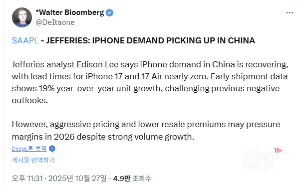 하지만 흥미롭게도, 제프리스는 “중국 내 아이폰 전체 판매량은 되려 증가세를 보이고 있다”고 분석했다. 보고서에 따르면, 아이폰 17 출하 이후 첫 5주 동안 중국 시장의 아이폰 판매량은 전년 대비 19% 증가한 것으로 집계됐다.