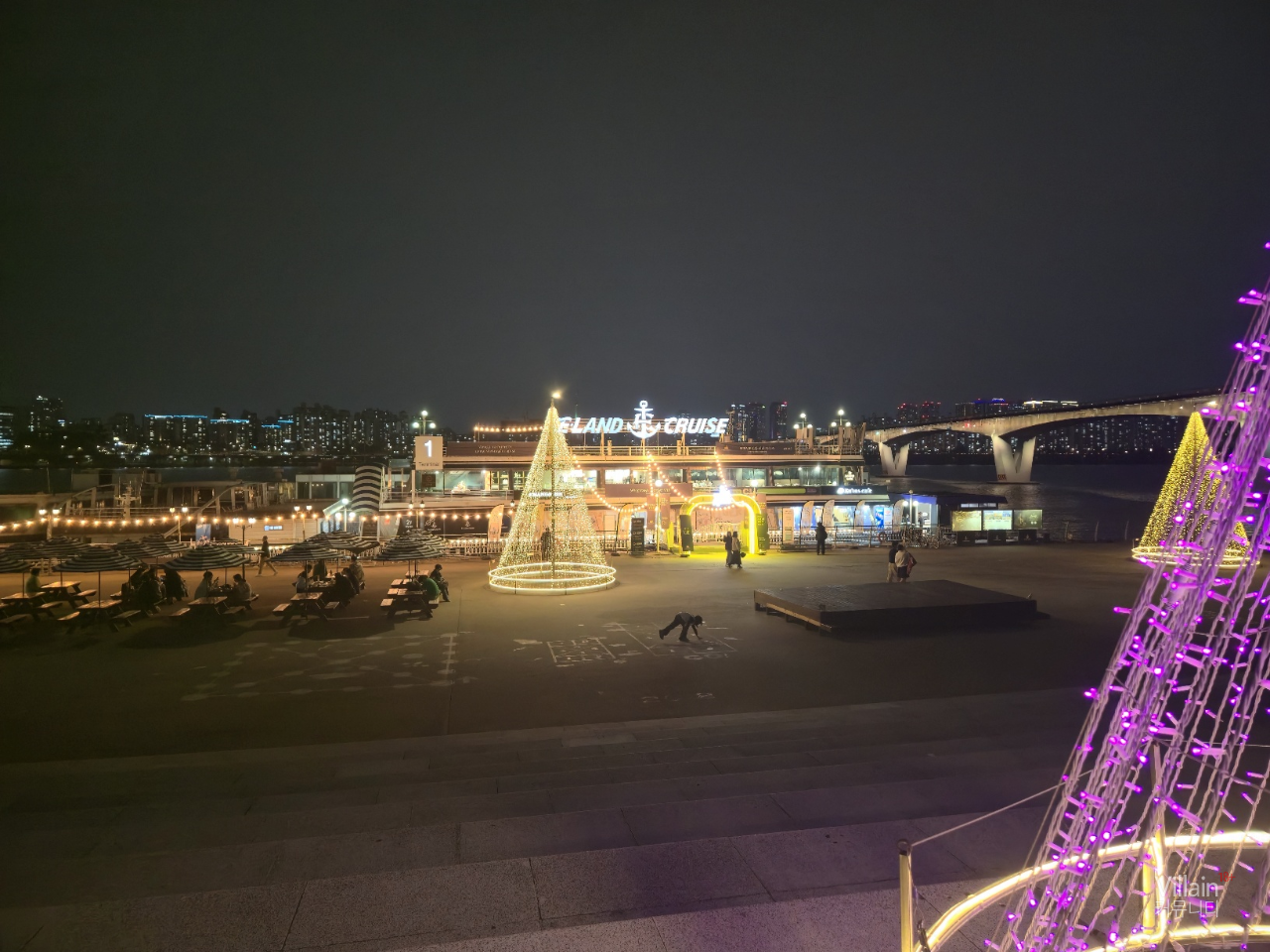 오후 6시, 많은 사람들이 한강 앞에서 운동도 하시고, 걸어다니는 커플, 이쁜 LED 조명 아래에서 사진을 찍는 여행객 등