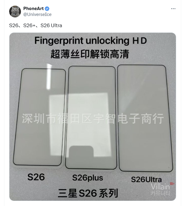 유명 IT 팁스터 아이스유니버스(Ice Universe) 는 최근 SNS를 통해 갤럭시 S26 시리즈용 스크린 프로텍터 이미지를 공개했다. 이 중 S26 울트라 모델의 보호필름은 분명히 둥근 모서리 형태를 띠고 있으며, 기존 노트 시리즈의 ‘박스형 외관’을 벗어난 것이 확인된다. 전체적으로 아이폰의 디자인 언어에 더 가까운 부드러운 프로파일이다.