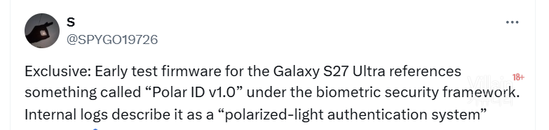 X(前 트위터) 계정 @SPYGO19726은 갤럭시 S27 울트라의 초기 테스트 펌웨어에서 “Polar ID v1.0” 항목이 발견되었다고 전했다. 내부 로그에는 이를 “편광광 기반 인증 시스템(polarized-light authentication system)”으로 명시하고 있으며, 삼성의 첫 비-적외선(Non-IR) 얼굴 인식 기술로 추정된다.