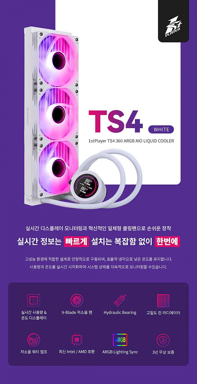 1stPlayer를 공급하는 맥스엘리트가 일체형 수냉 쿨러 ‘1stPlayer TS4 360 ARGB’를 정식 출시했다. 신제품은 블랙·화이트 컬러로 구성되며, 워터블록 디스플레이, ARGB PWM 팬 3개 일체형 프레임, 360mm 라디에이터, 직관적 케이블 구성 등 조립 편의성과 냉각 성능을 함께 갖춘 것이 특징이다. 인텔·AMD 최신 CPU 소켓을 폭넓게 지원하며, 3년 무상 보증과 생산물 배상책임보험도 제공된다.