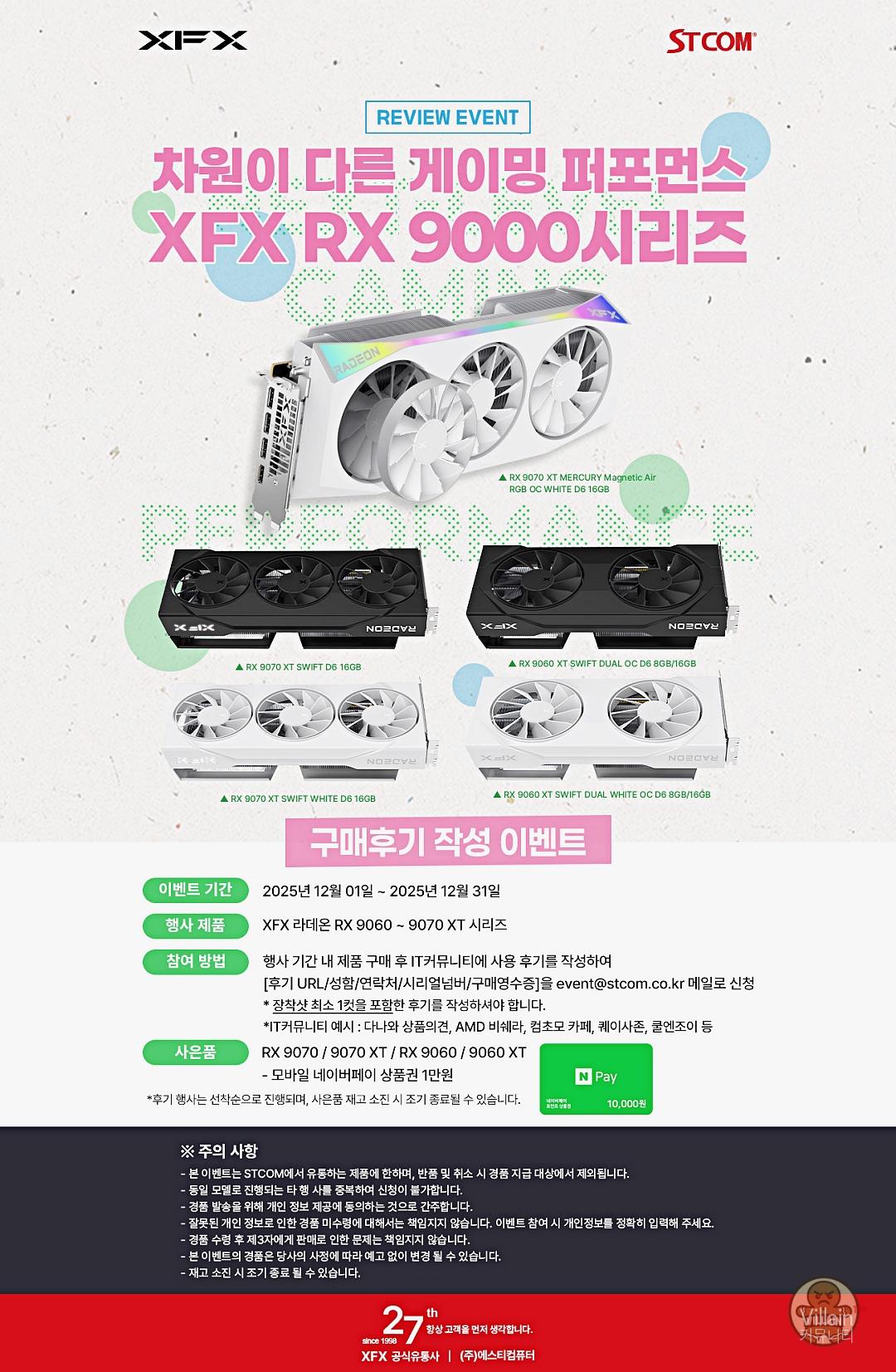 추가로 2025년 12월 27일까지 AMD에서 진행하는 포토 후기 이벤트도 중복하여 참여가 가능하므로 더욱 가성비 있게 XFX 그래픽카드를 구매할 수 있다. XFX 라데온 RX 9000 시리즈 제품 관련 상세 정보는 STCOM 홈페이지에서 확인할 수 있다.