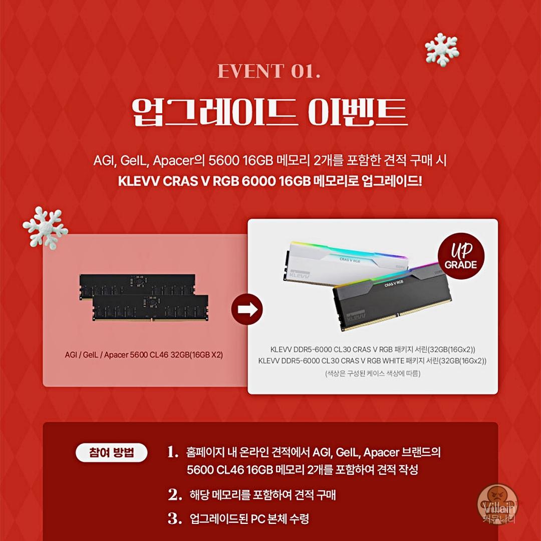 이번 이벤트 대상은 홈페이지 온라인 견적에서 AGI, GeIL, Apacer 브랜드 DDR5-5600 CL46 16GB 모듈 두 개를 포함한 구성으로 PC 본체를 구매한 고객이다. 해당 구성 주문 건은 에센코어 KLEVV DDR5-6000 CL30 CRAS V RGB 패키지로 자동 업그레이드된다. 색상은 조립 케이스의 색상에 맞게 조정된다.