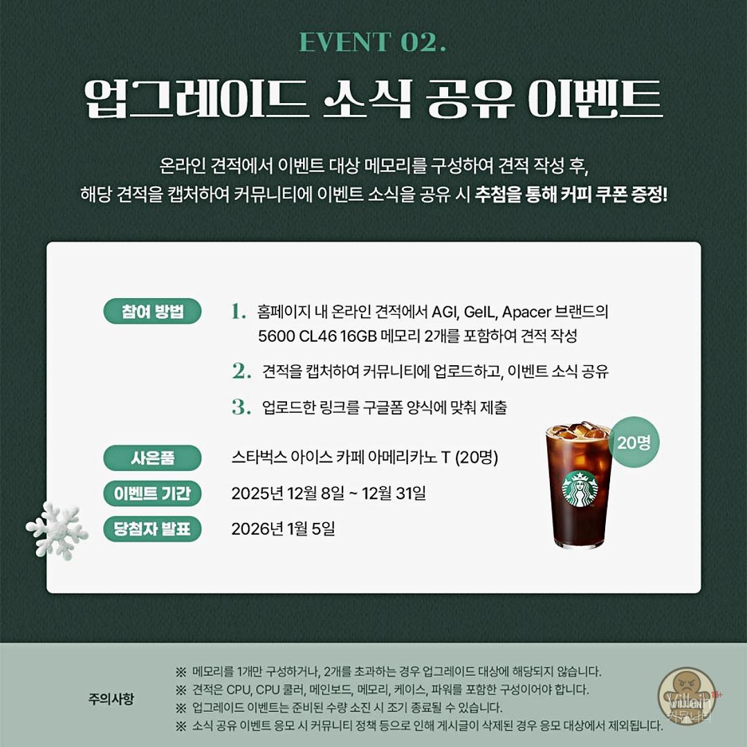 추가로 소식 공유 이벤트가 함께 진행된다. 온라인 견적에서 대상 메모리를 포함한 구성의 화면을 캡처해 커뮤니티에 공유하고, 해당 게시물 링크를 지정된 양식으로 제출하면 응모가 완료된다. 추첨을 통해 20명에게 스타벅스 아이스 카페 아메리카노 T 기프티콘을 제공하며 당첨자는 2026년 1월 5일 발표할 계획이다.