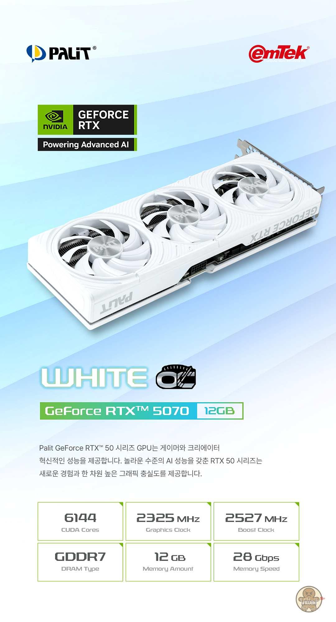 기존 PALIT 지포스 RTX™ 50 시리즈 블랙 컬러의 제품 외에도 순백의 화이트 감성의 PALIT 지포스 RTX 5070 WHITE OC D7 12GB 이엠텍은 초고속 GDDR7 메모리와 향상된 RT 코어 및 5세대 Tensor 코어가 탑제된 최신형 그래픽 카드로 CUDA Cores 6,144개, Boost Clock 2,527MHz을 제공한다.