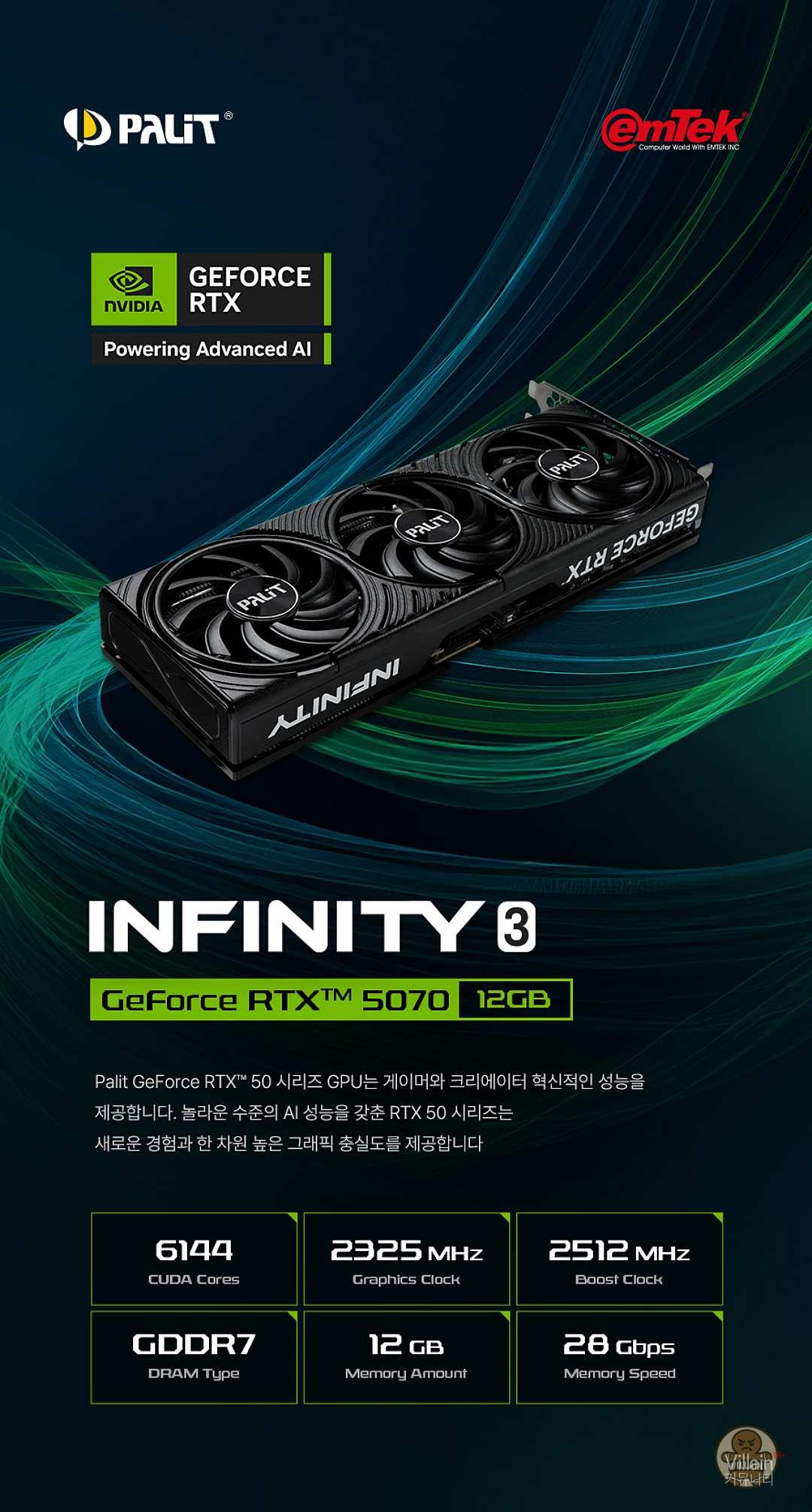 Palit 지포스 RTX™ 5070 Infinity 3 D7 12GB 이엠텍은 초고속 GDDR7 메모리와 향상된 RT 코어 및 5세대 Tensor 코어가 탑제된 최신형 그래픽 카드로 CUDA Cores 6,144개, Boost Clock 2,512MHz을 제공하며, 2 Slot 설계로 만들어져 케이스와의 호환성이 뛰어나며 다른 PCI Express 슬롯 부품과의 간섭이 적어 최적의 공간 활용과 뛰어난 성능을 보장하여 많은 게이머들과 크리에이터들의 이목을 사로잡는다.