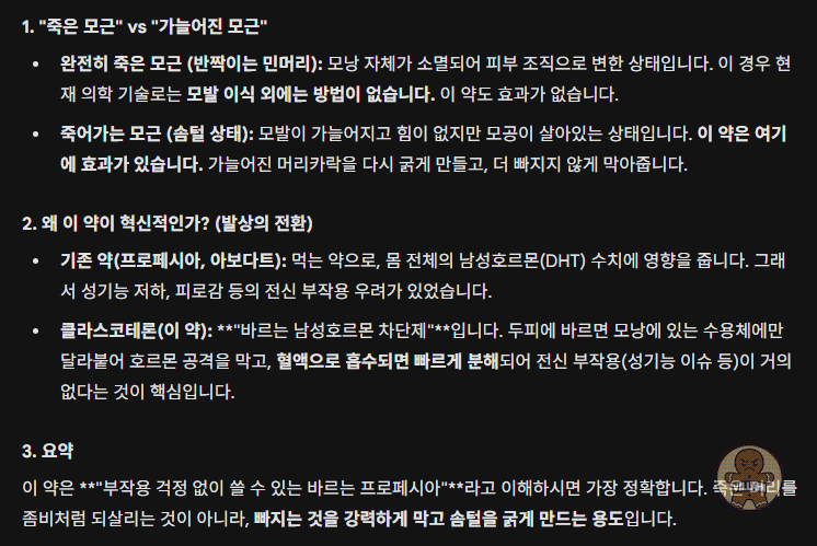 - 이 약은 초기~중기 단계의 탈모 형님들을 위한 약으로, 완탈 형님들은 치료 불가임 뒤진 모근은 못 살리지만, 이 약 바르면 죽어가는 모근은 살려서 풍성하게 만들어 줌