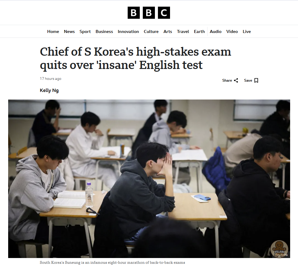 BBC는 올해 한국 대학수학능력시험 영어 영역이 수험생들 사이에서 “고대 문자를 해독하는 수준”, “정신 나간(insane) 시험”이라는 반응을 낳았다고 전했다. 영어 시험이 실제 언어 능력을 평가하기보다는 의미를 알기 어려운 추상적 텍스트를 해석하도록 요구했다는 비판이 이어지고 있다.