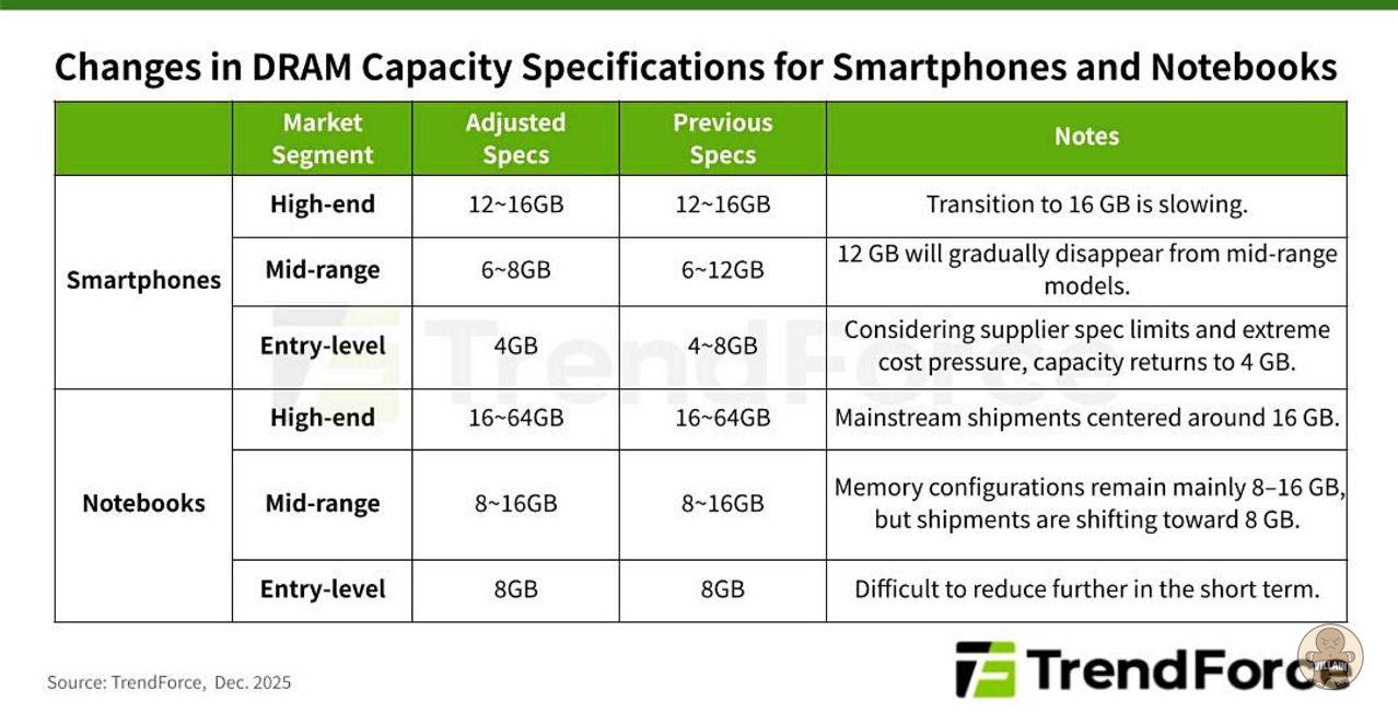 시장 조사 기관 트렌드포스는 현재 DRAM 부족 상황이 최소 2027년 4분기까지 이어질 수 있다고 보고 있다. 이 경우 보급형 스마트폰은 4GB 램을 기본으로 제공하는 방향으로 되돌아갈 수 있으며, 소비자는 동일한 사용 경험을 유지하기 위해 더 높은 가격대의 모델을 선택해야 할 수도 있다.