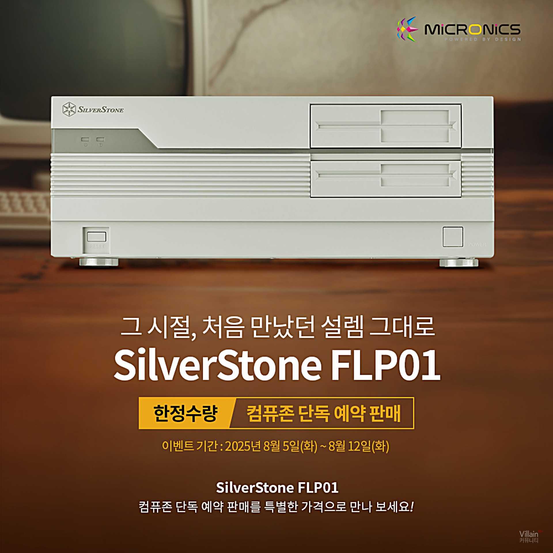 마이크로닉스가 수평형 데스크톱 PC의 클래식한 디자인을 현대적으로 재구성한 PC 케이스 실버스톤 FLP01의 예약판매를 컴퓨존에서 진행한다. 예약판매는 8월 5일부터 12일까지 한정 수량으로 운영되며, 해당 기간 동안 145,000원에서 할인된 130,000원에 구매할 수 있다. 제품은 8월 12일 이후 순차 발송된다.
