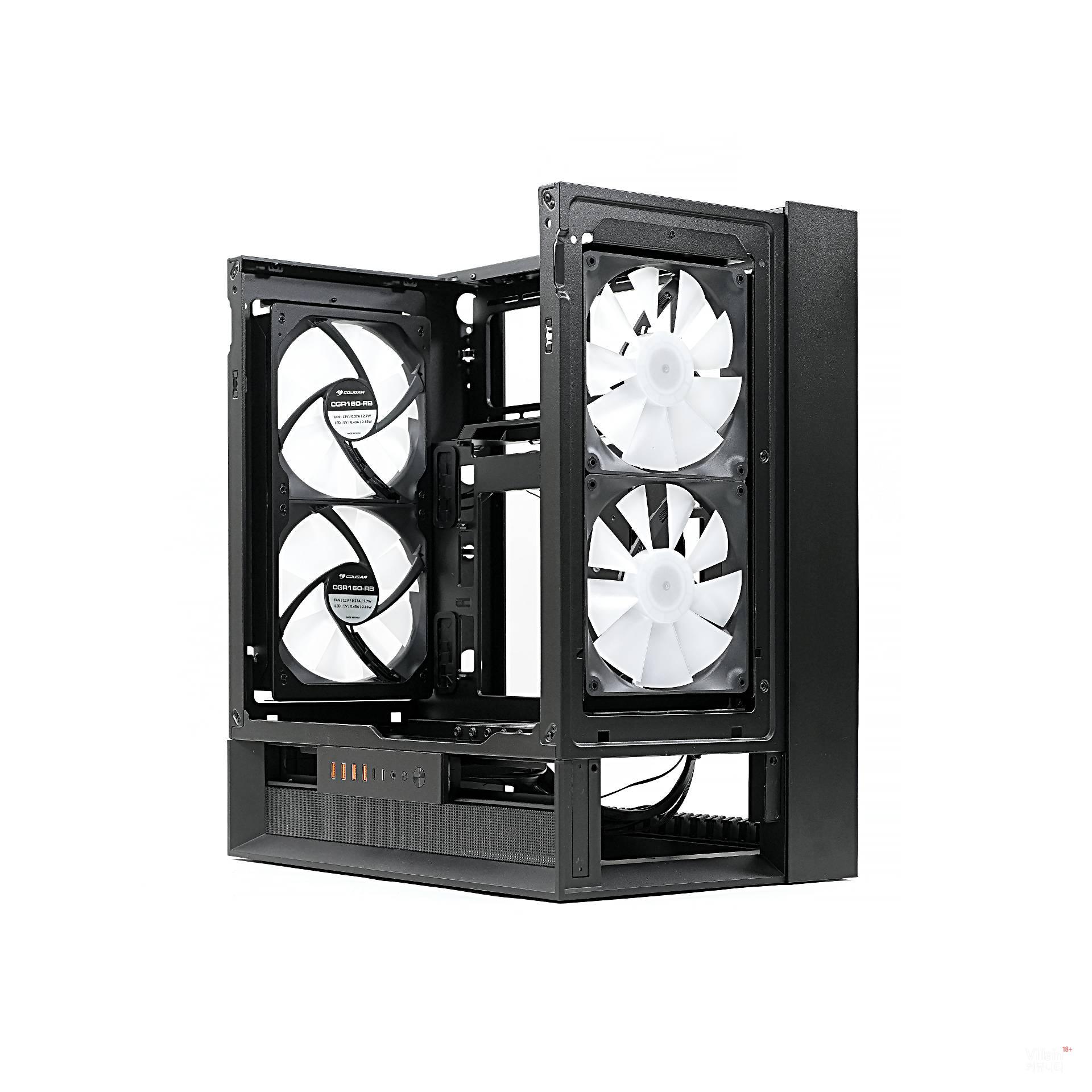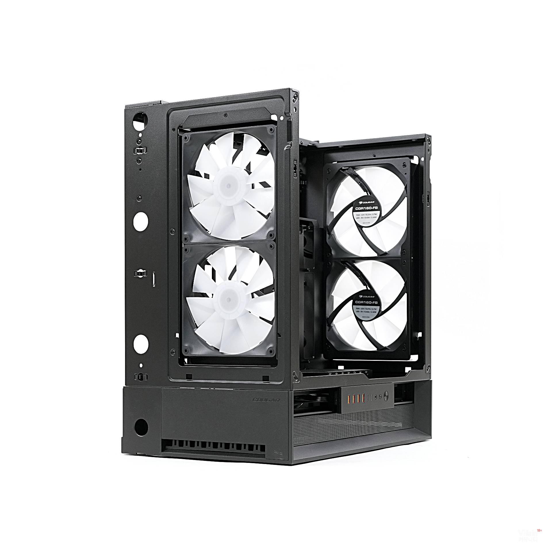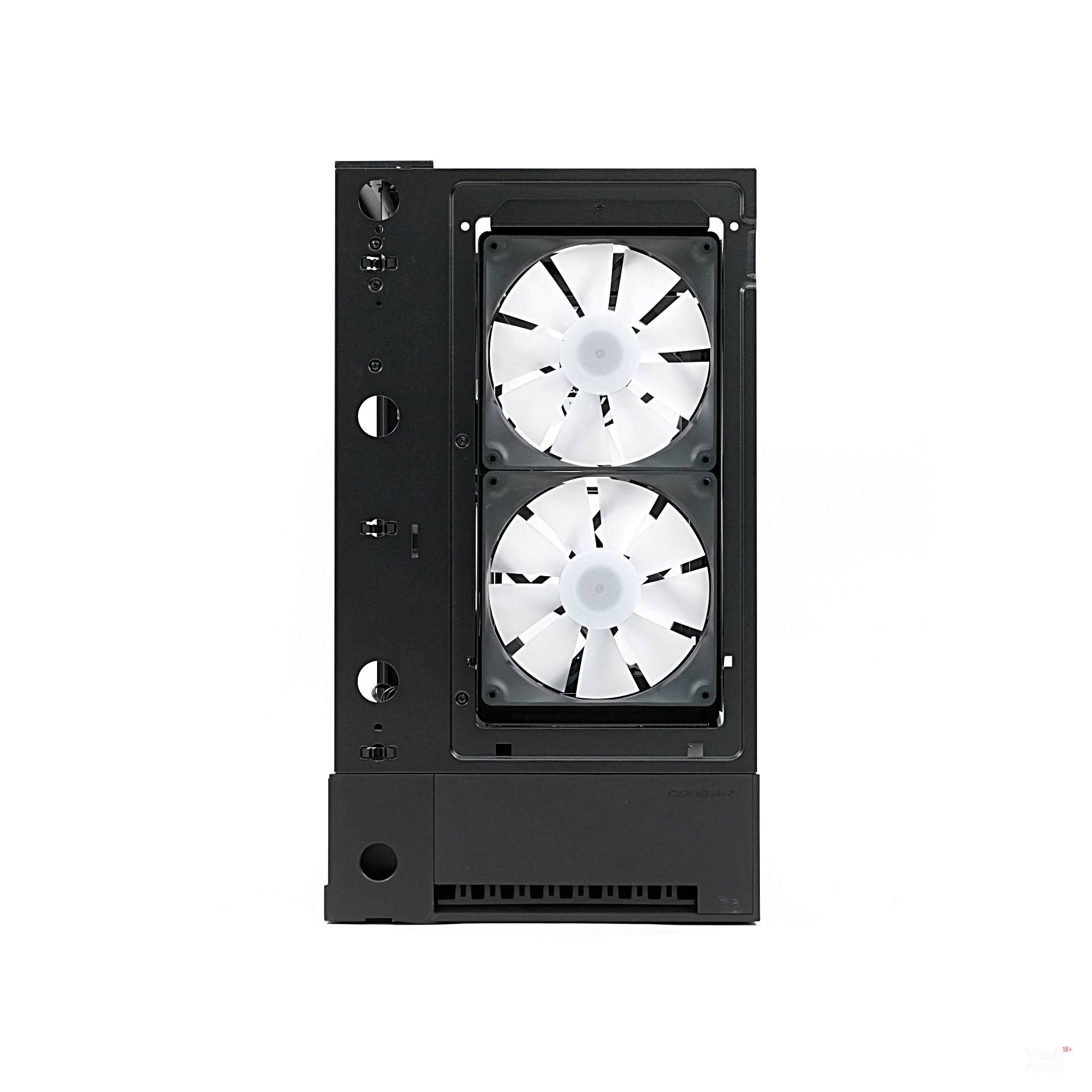 전면에는 흡기 팬 2개, 후면에는 배기 팬(리버스) 2개가 설치돼 완벽하게 균형을 맞춘다. 덕분에 전면에서 유입된 찬 공기가 GPU와 CPU를 가로질러 후면으로 곧게 배출된다. 또한, 이렇게 설정하면 케이스 방향과 관계없이 일정하게 GPU와 맞닿는 공기 흐름을 최대화할 수 있다. COUGAR가 이를 Omnidirectional Dynamic Flow(ODF) 시스템이라 부르는 이유다.