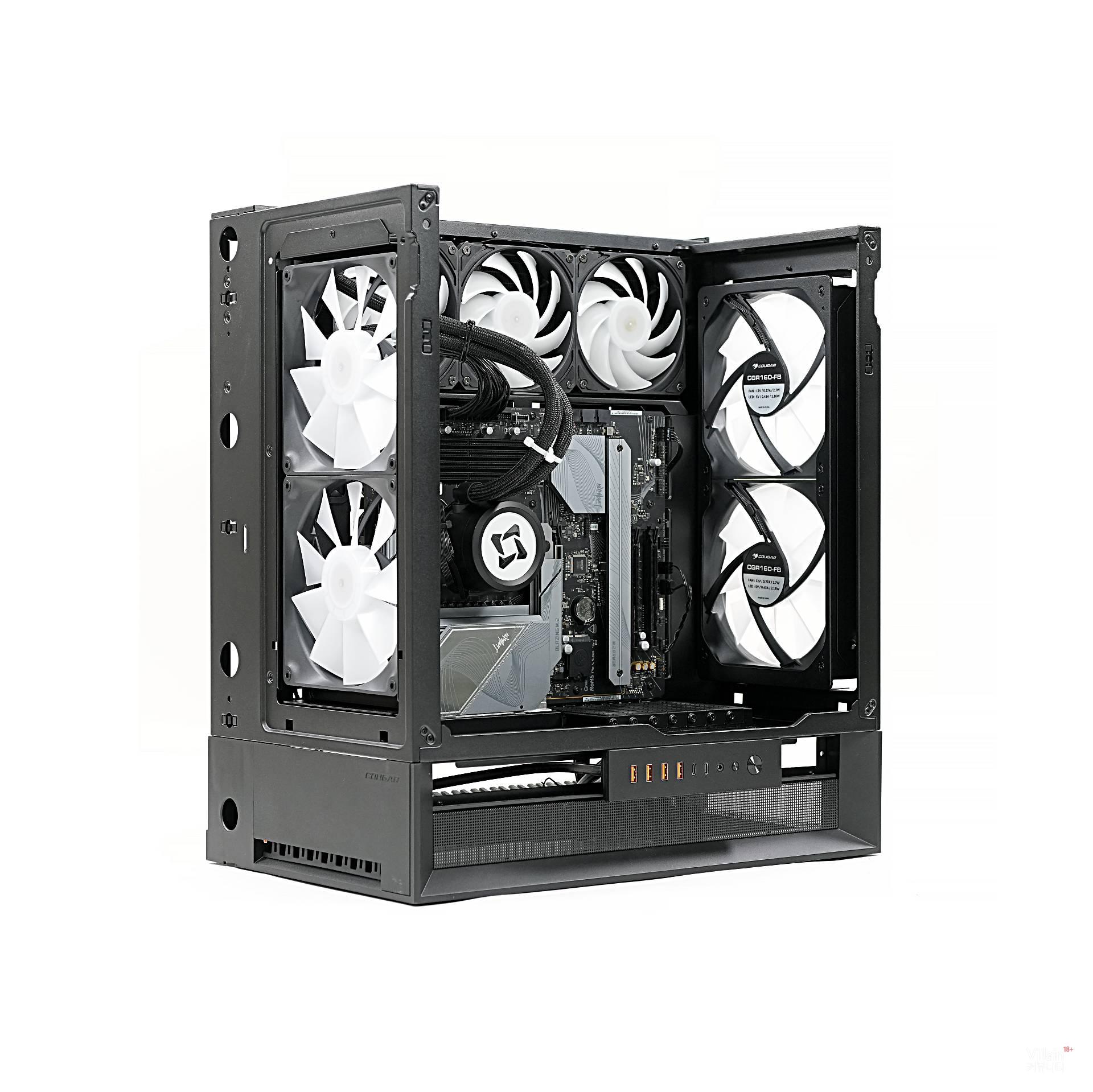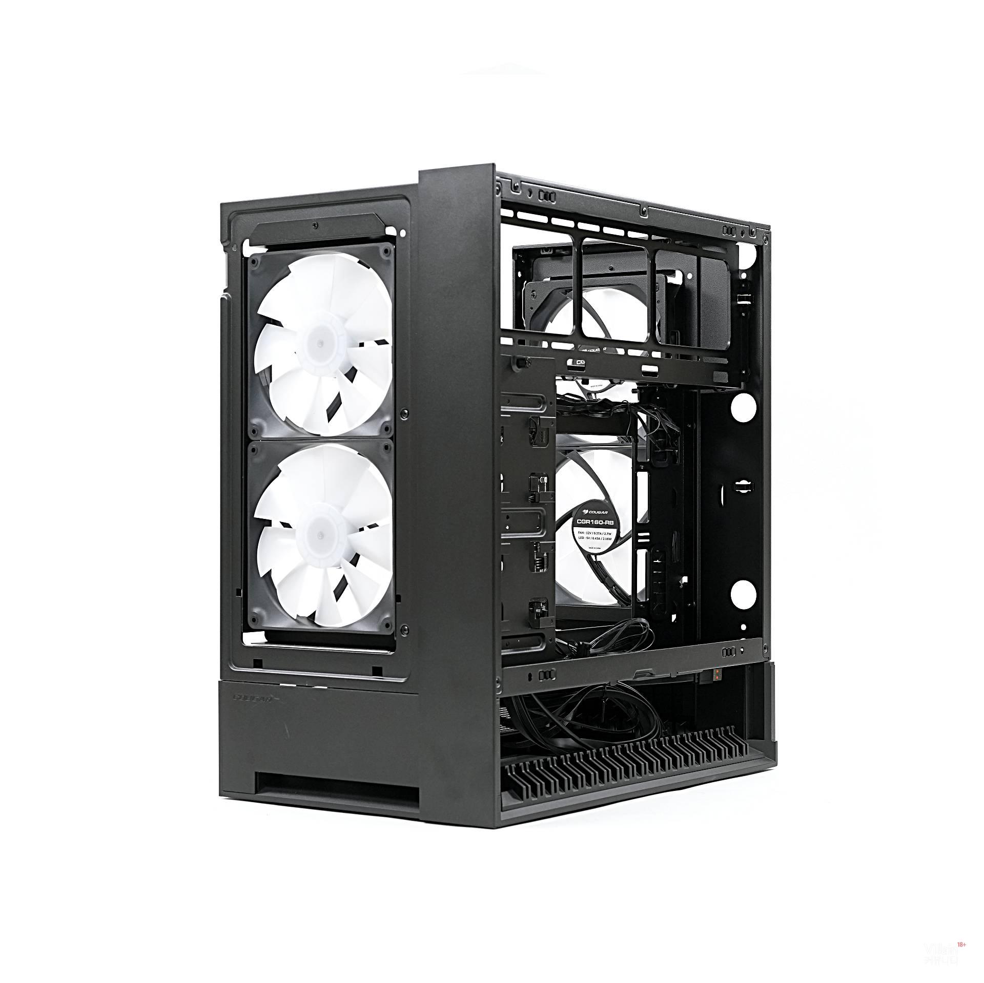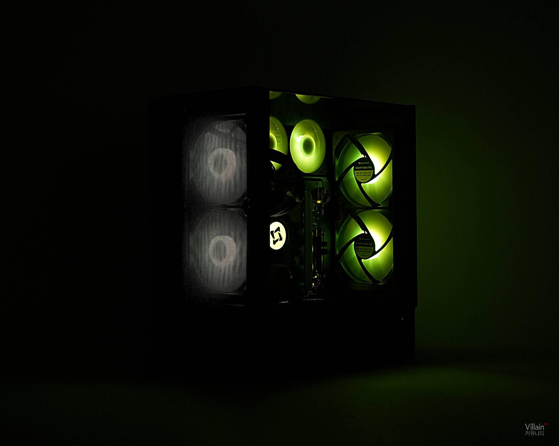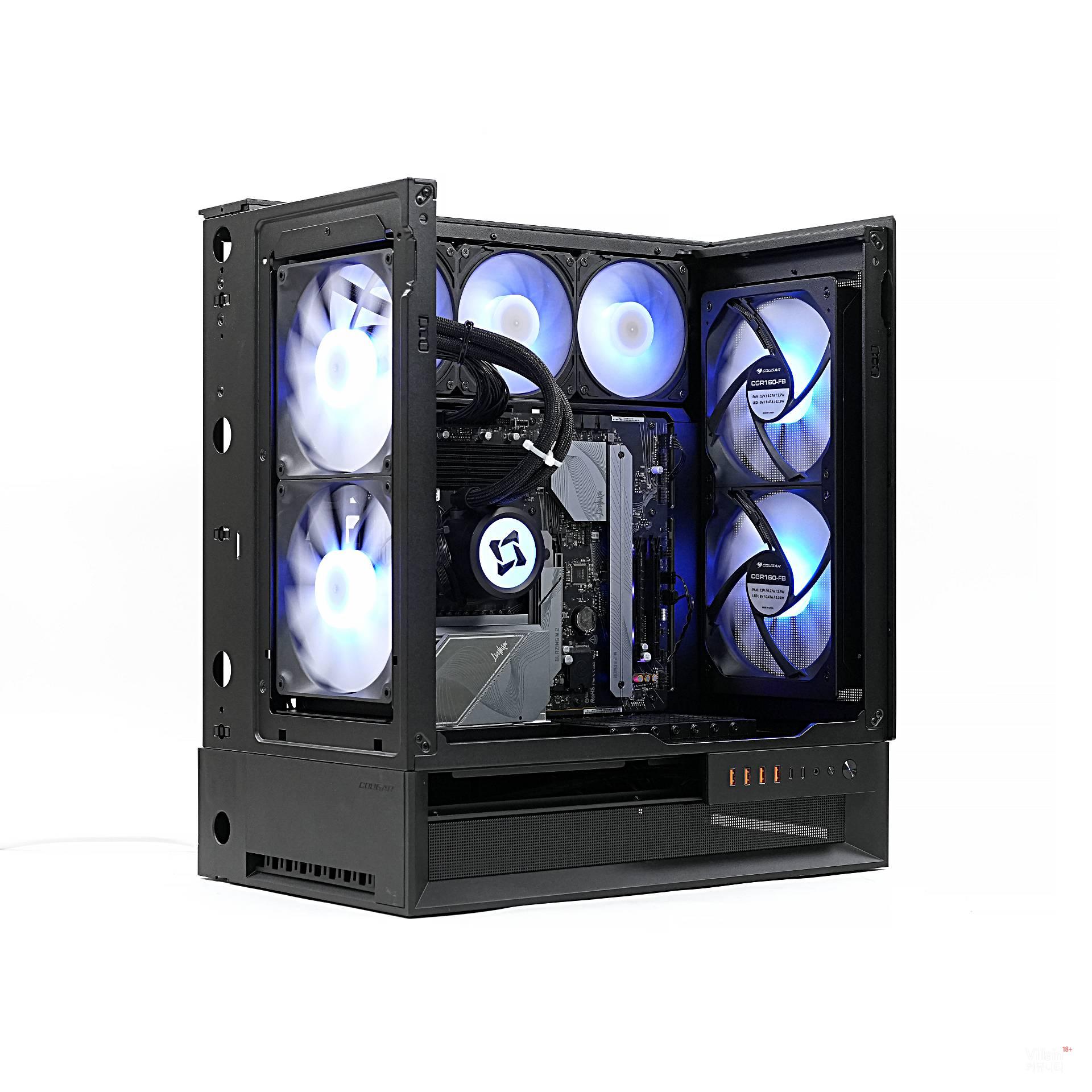 전면에는 흡기 팬 2개, 후면에는 배기 팬(리버스) 2개가 설치돼 완벽하게 균형을 맞춘다. 덕분에 전면에서 유입된 찬 공기가 GPU와 CPU를 가로질러 후면으로 곧게 배출된다. 또한, 이렇게 설정하면 케이스 방향과 관계없이 일정하게 GPU와 맞닿는 공기 흐름을 최대화할 수 있다. COUGAR가 이를 Omnidirectional Dynamic Flow(ODF) 시스템이라 부르는 이유다.