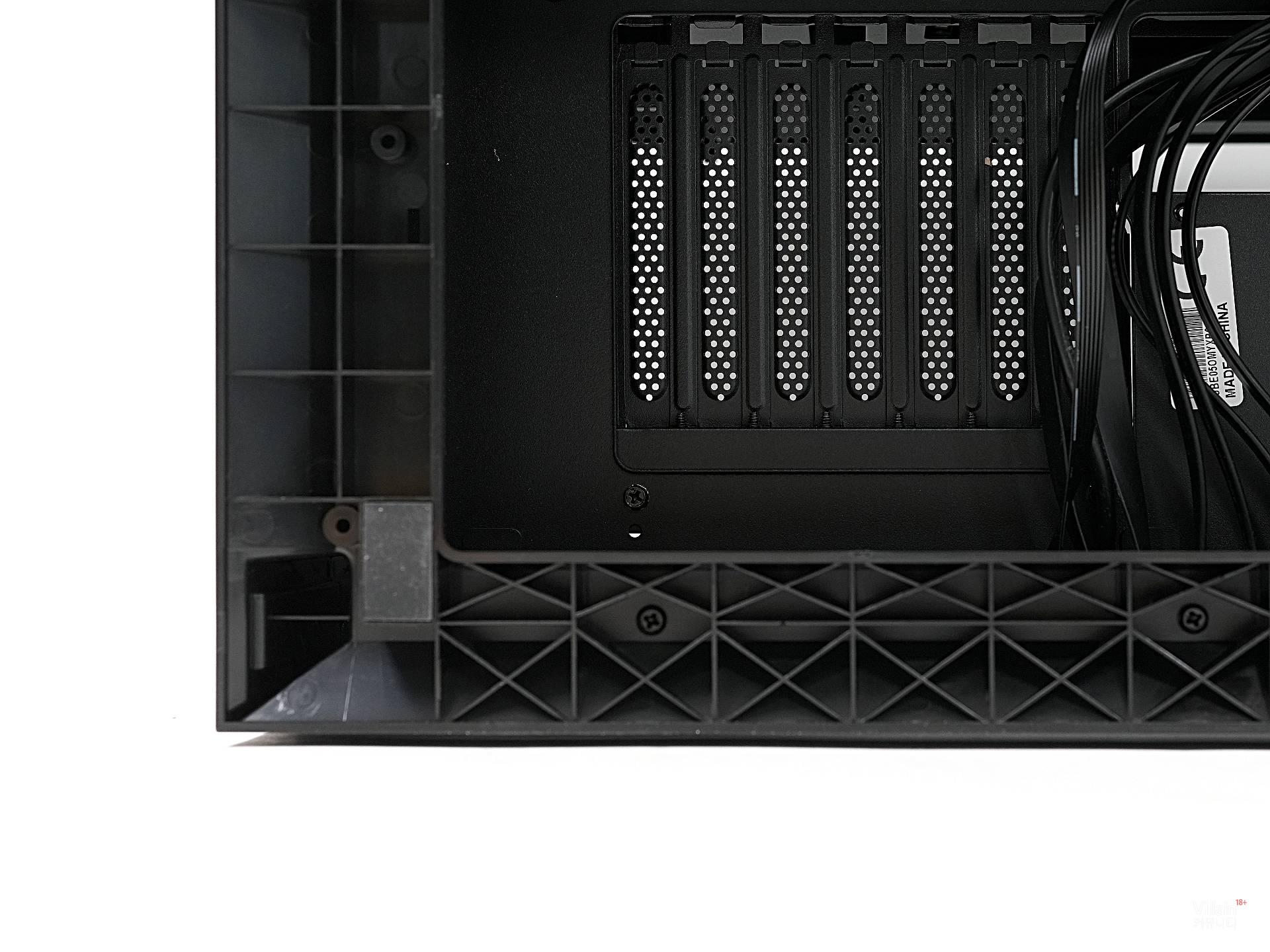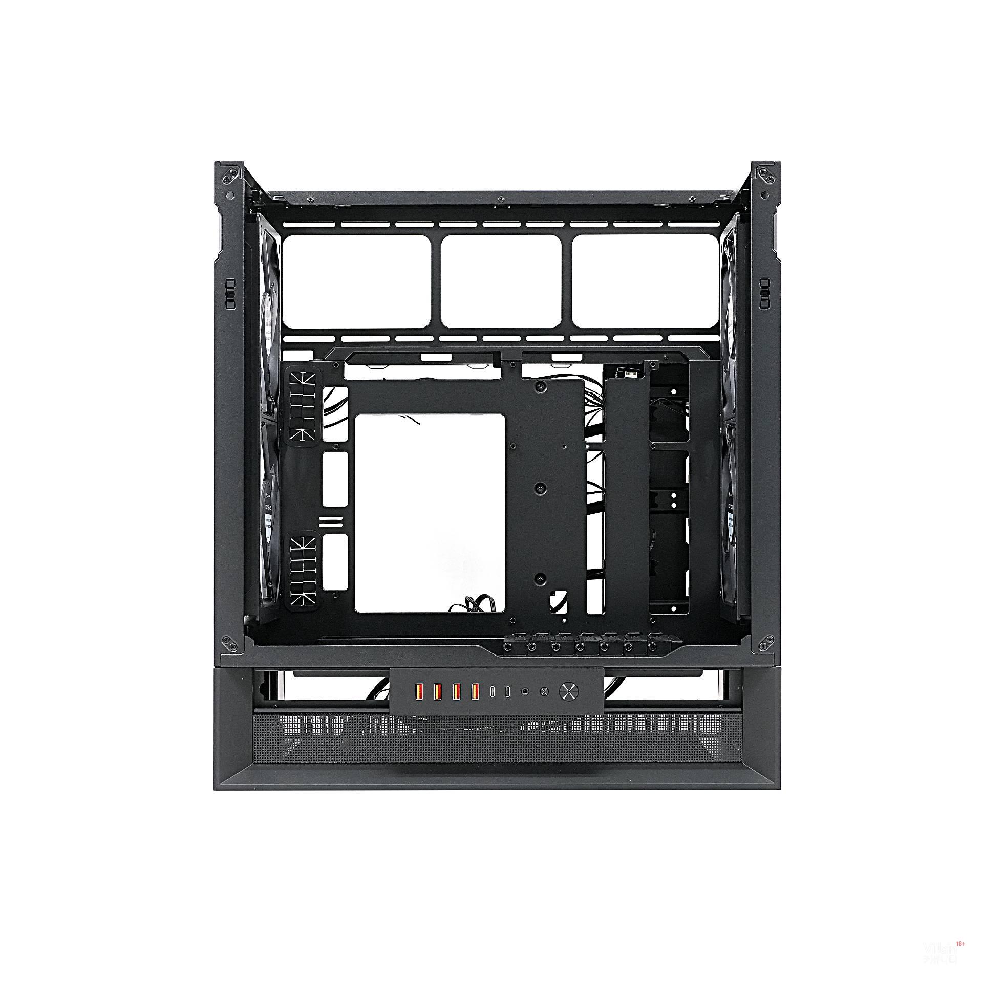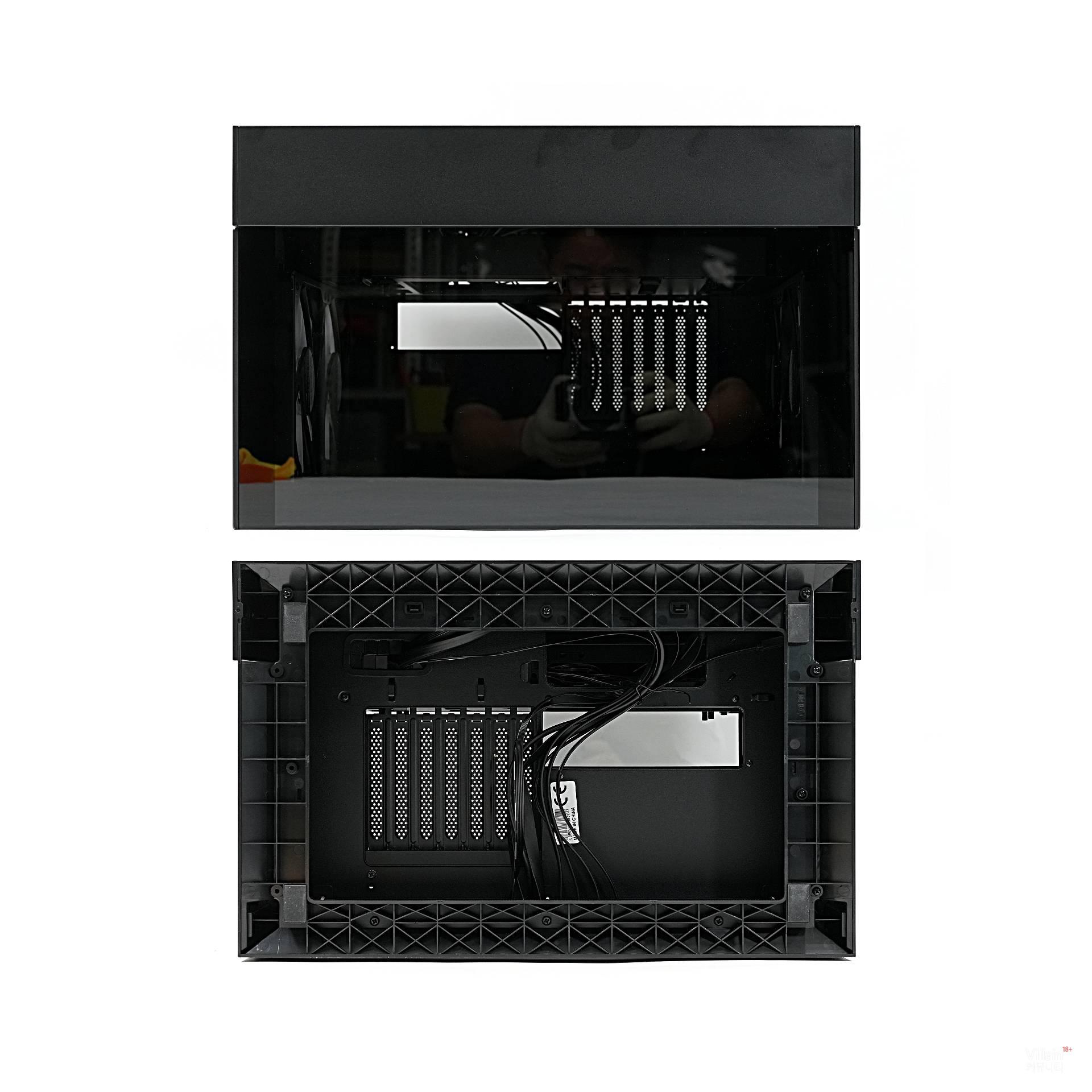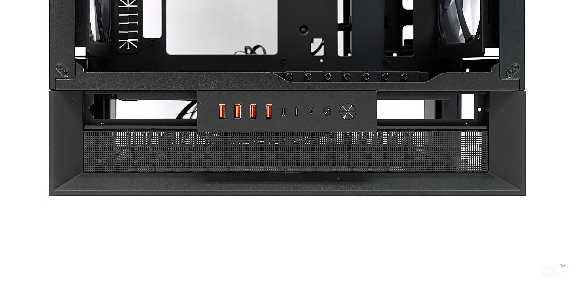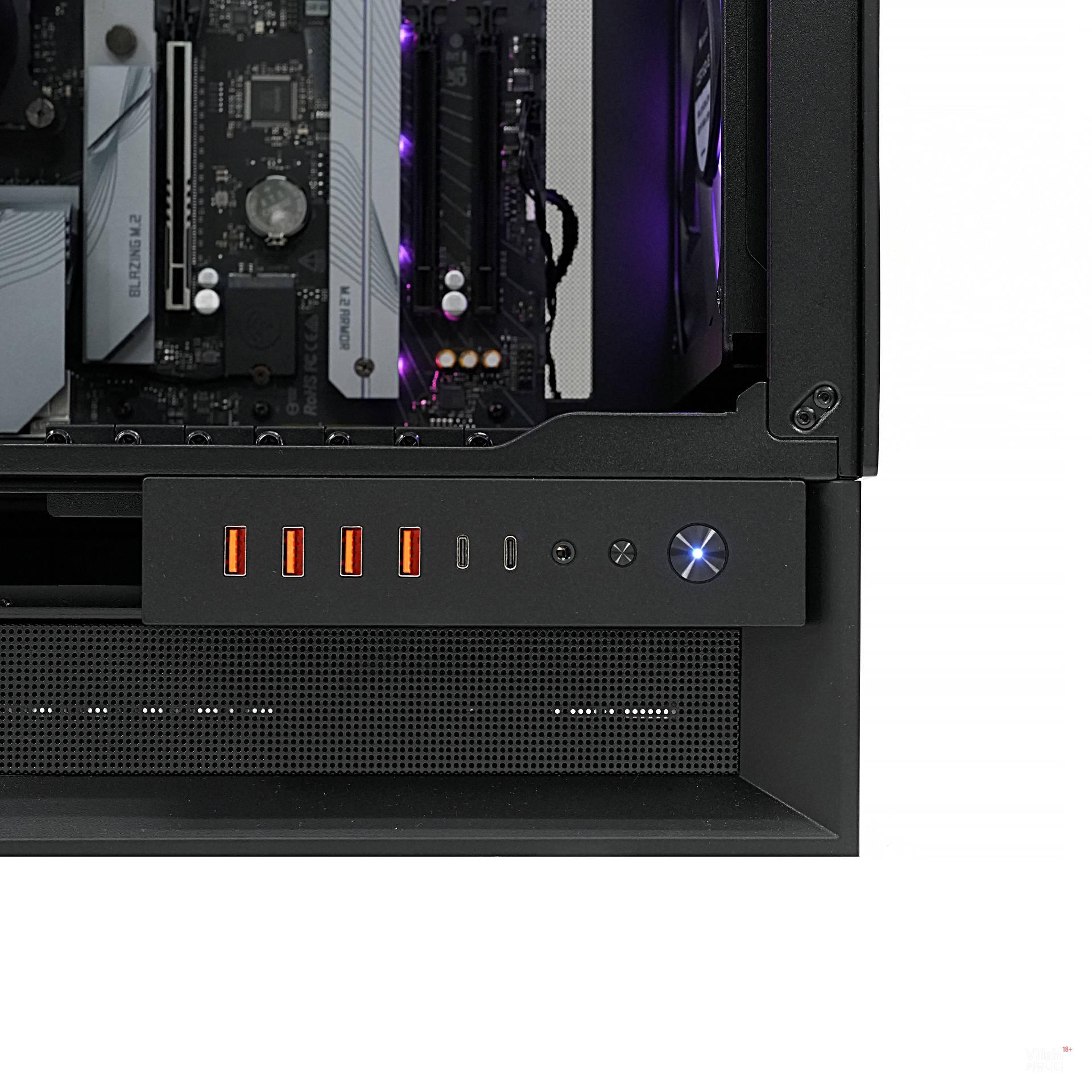 사실 메인보드를 돌려 백패널이 상단으로 오도록 하는 시도는 몇 차례 있었다. 하지만 Omny X는 거기서 한 걸음 더 나아갔다. 후면도 아닌 하단으로 메인보드 백패널을 옮긴 것이다. 그리고 이 상태에서 케이블을 완전히 하단으로 감추는 데 성공했다. 덕분에 어느 방향에서 보아도 케이블이 보이지 않는, 제로 비저빌리티 케이블 매니지먼트가 가능해졌다. 눈에 거슬리지 않아 참으로 마음이 편하다. 아, 시원하다.